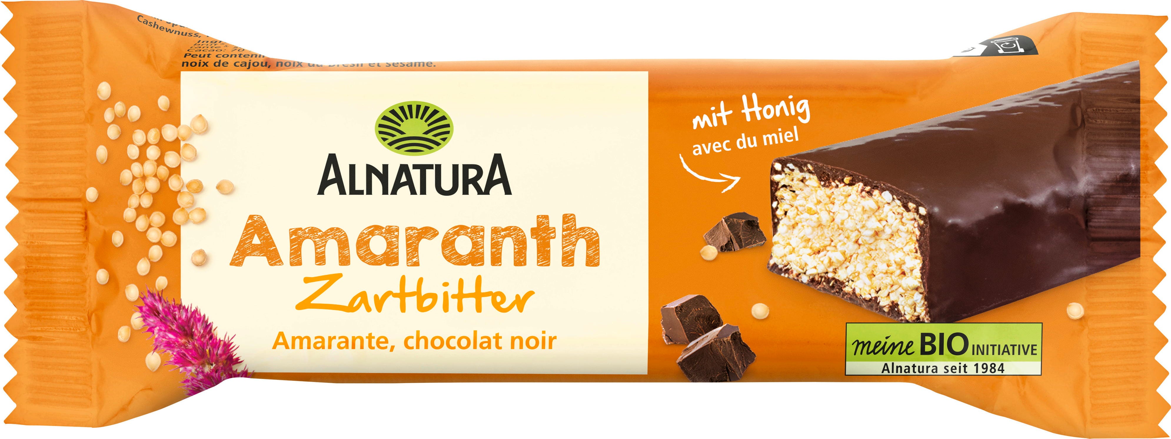 Bio amarantova ploščica s temno čokolado znamke Alnatura je optimalen prigrizek za vmes. Amarant, obogaten z medom, je zavit v temno čokolado. Delež kakava v čokoladi je najmanj 70 %.