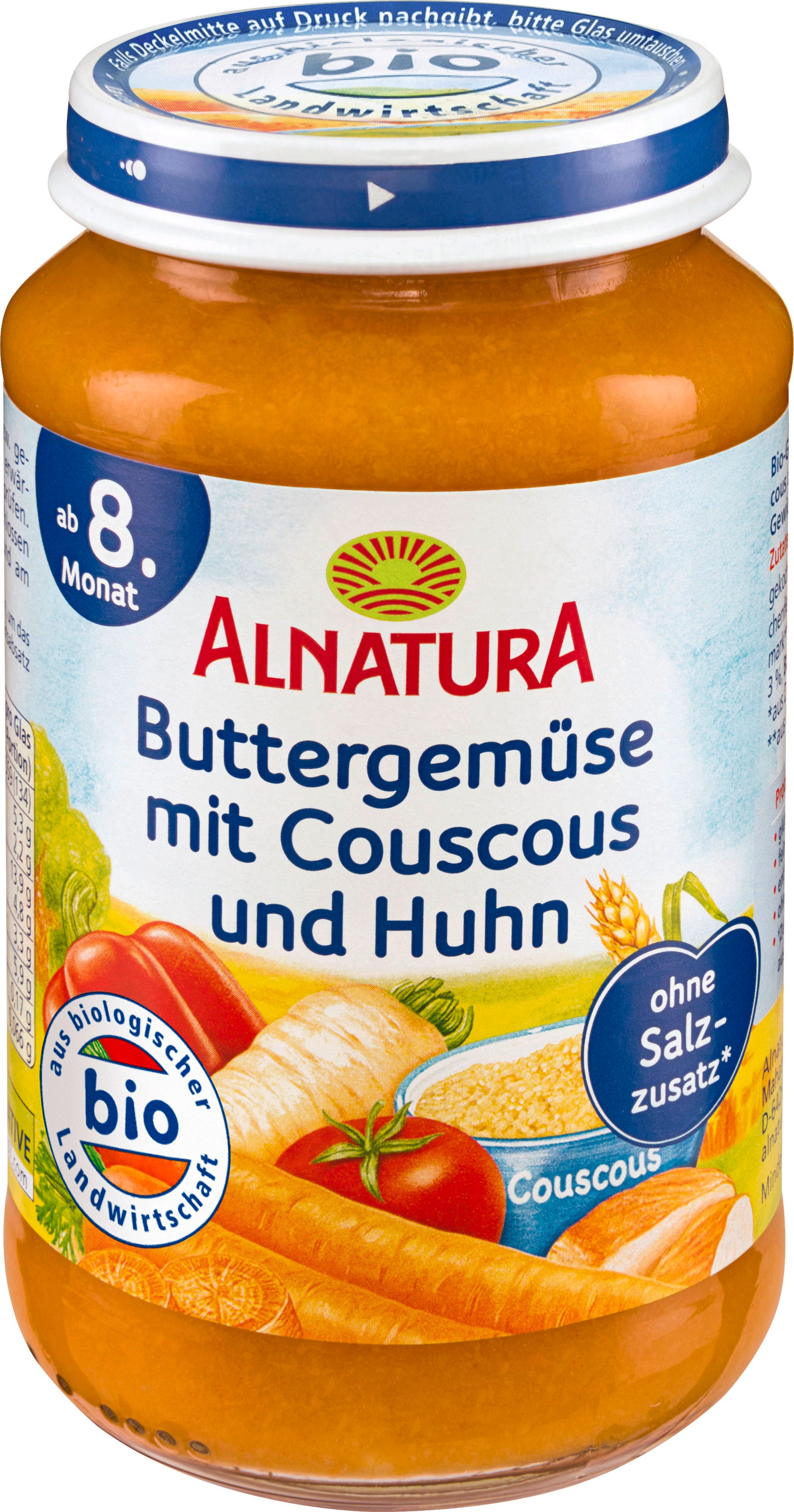 Ekološki obrok z masleno zelenjavo, kuskusom in piščancem znamke Alnatura je pripravljen brez dodane soli. Majhni koščki oziroma tekstura obroka spodbujajo otroka k žvečenju. Vse sestavine so ekološke kakovosti.