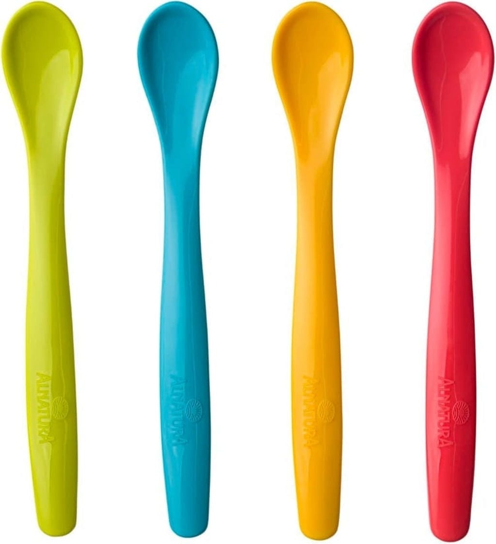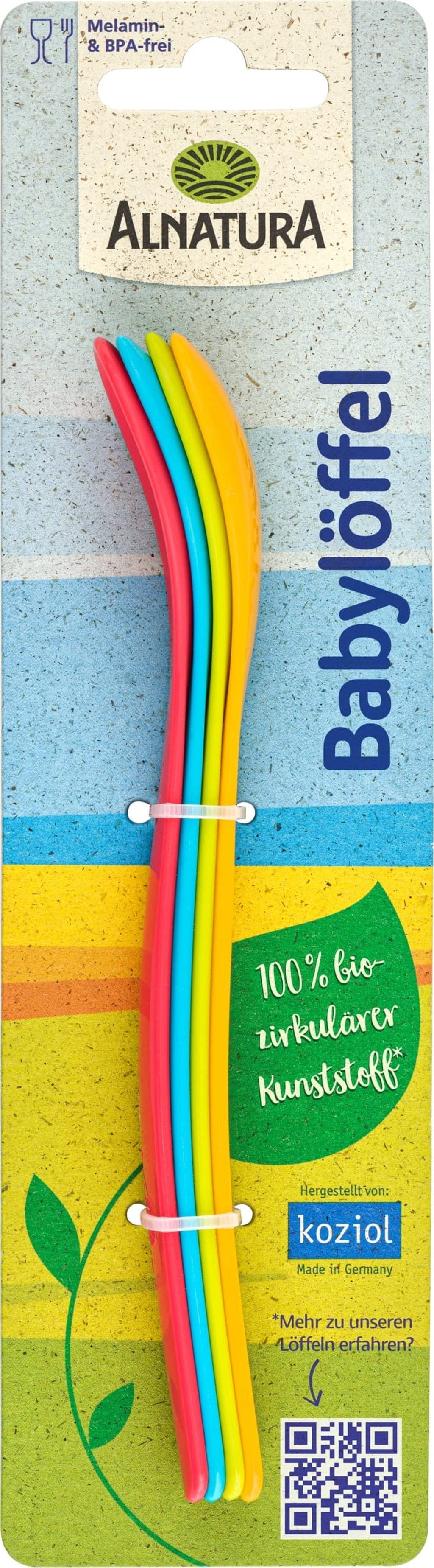 Štiri pisane otroške žličke iz trajnostne plastike, proizvedene iz recikliranega sončničnega in repičnega olja. Ne vsebujejo melamina, bisfenola A in mehčalcev. Prav tako so brez vonja, odporne na slino in primerne za pomivanje v pomivalnem stroju – idealne za vsakodnevne obroke vašega malčka.