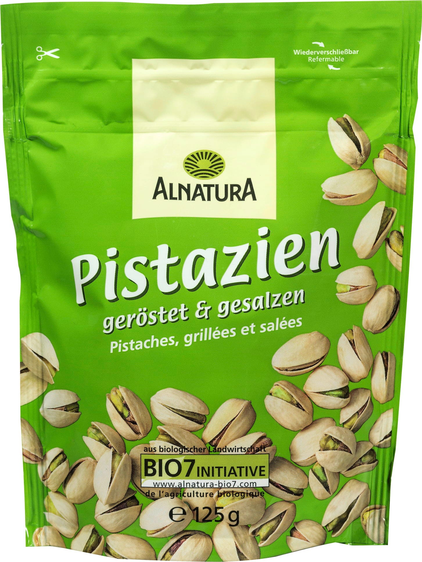 Ekološke pistacije znamke Alnatura so aromatično pražene in obogatene z morsko soljo. So fino hrustljave in vsestransko uporabne. Odlične so kot samostojen prigrizek, v solatah ter tudi v pekovskih izdelkih in sladicah.
