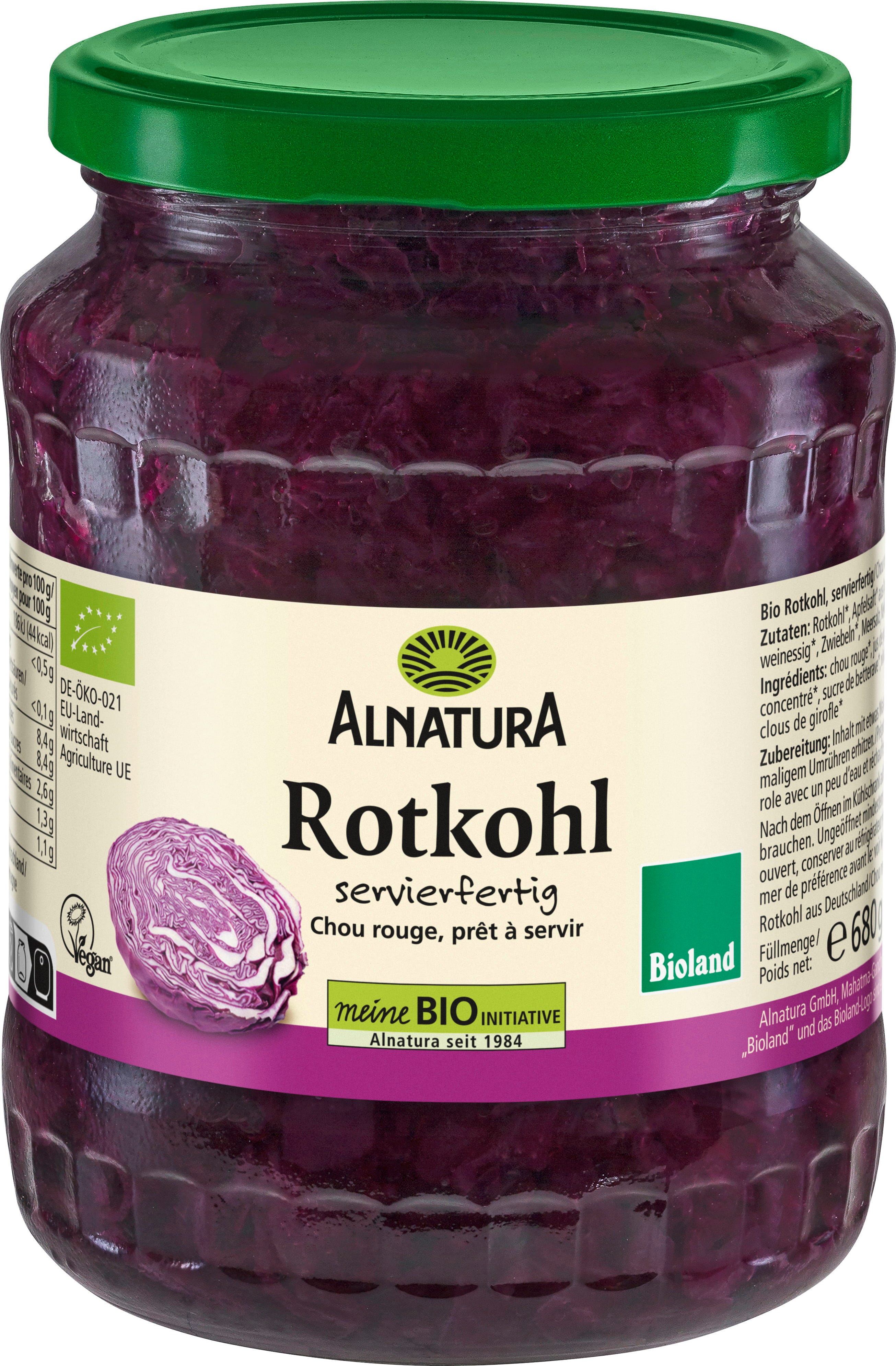 Klasika za hladnejše in prijetne dni: bio rdeče zelje Alnatura v kozarcu je oplemeniteno z jabolčnim sokom. V njem se prepletata nežna sladkoba in svežina, ki bosta zagotovo popestrili vaše krepke dušene jedi, pečenke in cmoke. To vegansko klasiko iz Nemčije v hipu pripravite tako, da jo z malo vode segrejete v loncu.