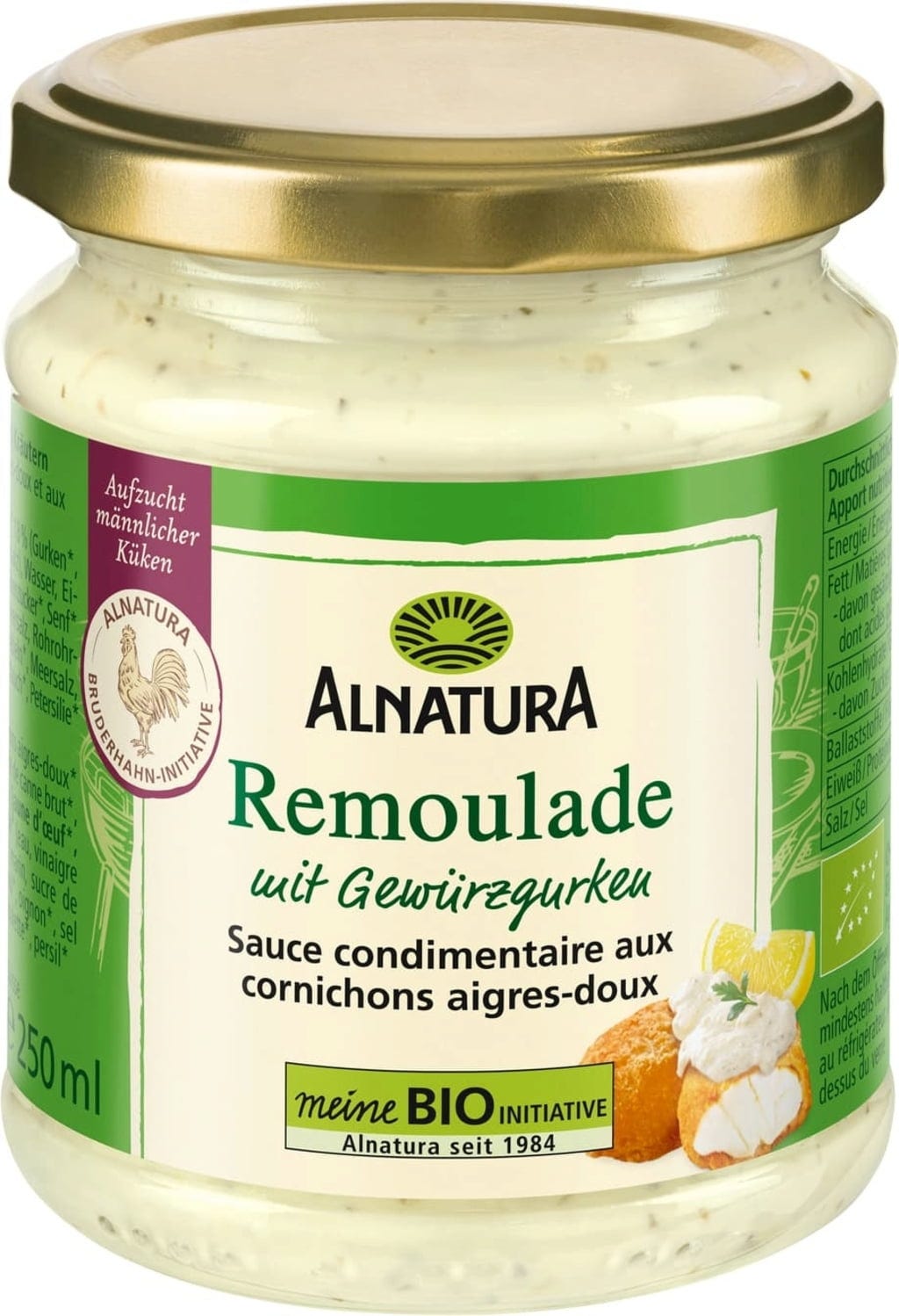 Bio remulada znamke Alnatura je kremna in začinjena klasika med omakami, ki ne sme manjkati v nobeni kuhinji. S svojo bogato teksturo, v kateri se prepletajo koščki kislih kumaric in izbranih zelišč, dobi remulada svojo prepoznavno fino aromo. Receptura je oplemenitena s skrbno izbranimi začimbami in se odlično poda k različnim jedem: kot pikantna omaka h ribam, govejemu pečenju (roastbeef) ali kuhanim jajcem, odlično pa harmonira tudi s številnimi drugimi prigrizki.