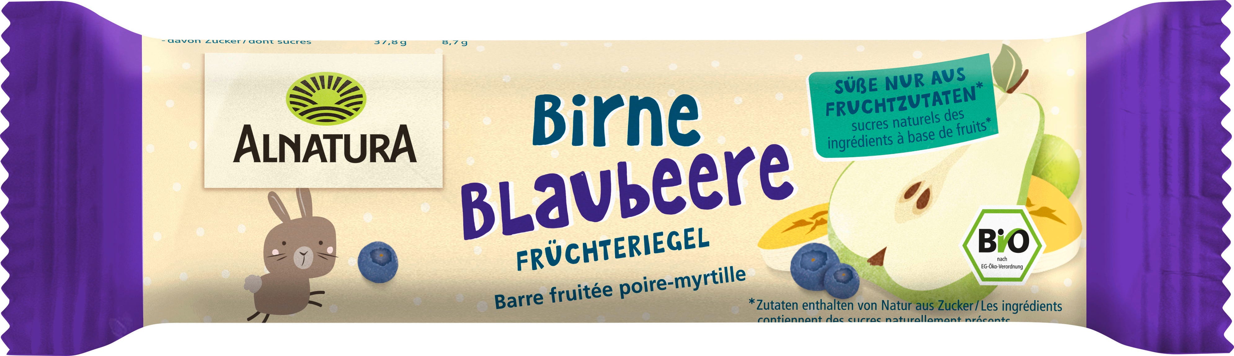Bio sadna ploščica Alnatura hruška-borovnica je primerna za otroke od 3. leta starosti dalje. Sadno-žitna ploščica z aromatičnim jagodičevjem je sestavljena iz mešanice koncentrata hruškovega in borovničevega soka ter polnozrnate ovsene moke in polnozrnatih pšeničnih kosmičev med dvema oblatoma. Vse sestavine izvirajo iz ekološkega kmetijstva.