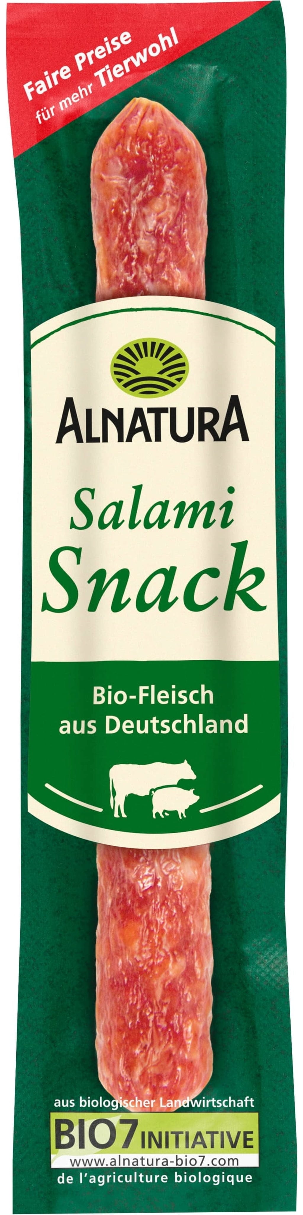 Bio salami prigrizek znamke Alnatura je krepak, nežno prekajen in blago začinjen. Salami prigrizek je idealen za manjši prigrizek med obroki. Meso izvira izključno z nemških kmetij zveze Naturverbund, ki stavijo na vrsti primerno rejo živali in trajnostno gospodarjenje. Vse sestavine so iz ekološkega kmetijstva.