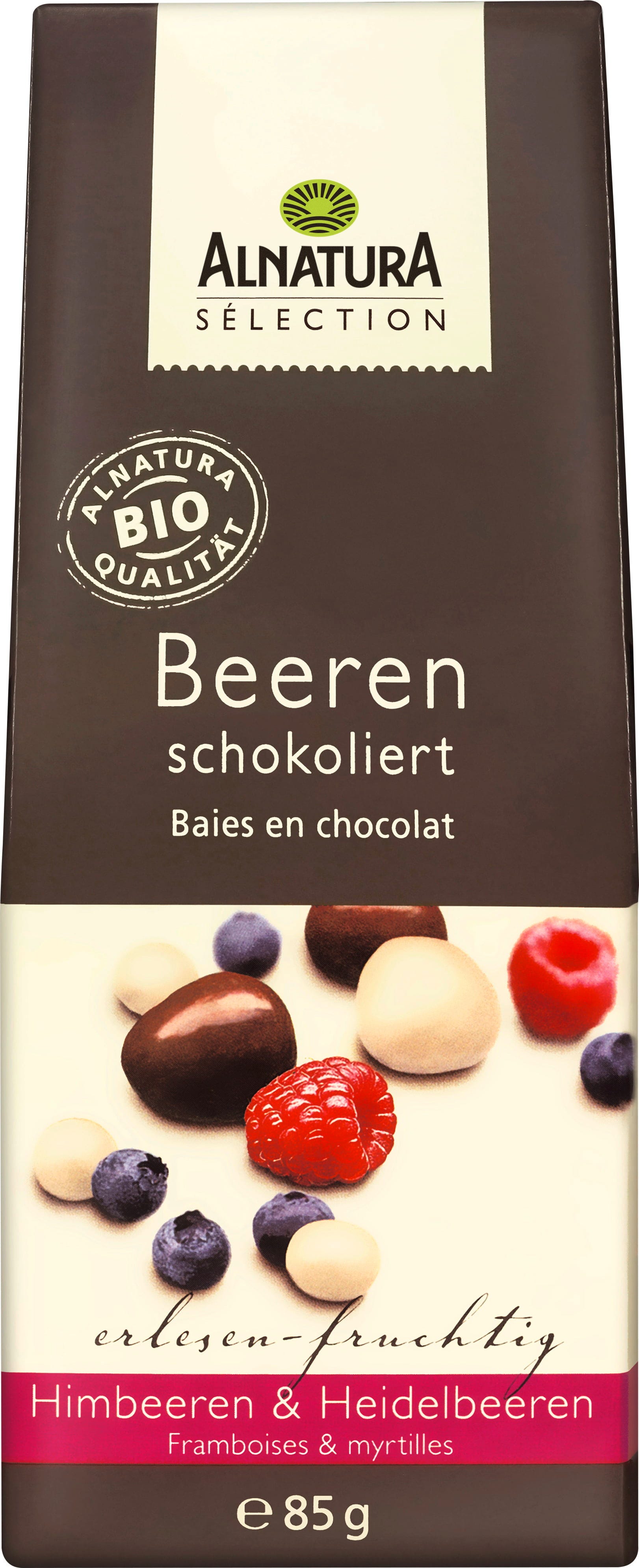Pri Bio Sélection jagodičevju v čokoladi znamke Alnatura so liofilizirane bio maline in bio borovnice ovite v fino mlečno in jogurtovo čokolado. Poskrbijo za sadno-čokoladno doživetje okusa. Jagodičevje je popolno za sladkanje, pa tudi kot dekorativni posip za kolačke (cupcakes) ali torte.