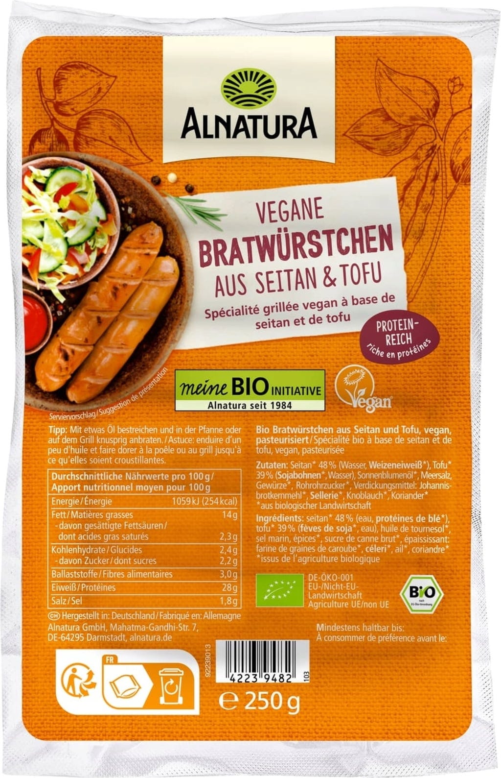 Veganske bio "klobasice" znamke Alnatura navdušujejo s pikantno začinjeno recepturo na osnovi tofuja in seitana (pšeničnih beljakovin). V njih se čudovito prepletata sočna tekstura in bogata aroma začimb, celotno jed pa oplemenitijo s svojo vsestranskostjo. Te majhne klobasice so izjemno uporabne: ne glede na to, ali jih popečete v ponvi ali na žaru, se odlično podajo k solatam, zelenjavnim jedem ali pa jih preprosto uživate z malo omake v bombetki.