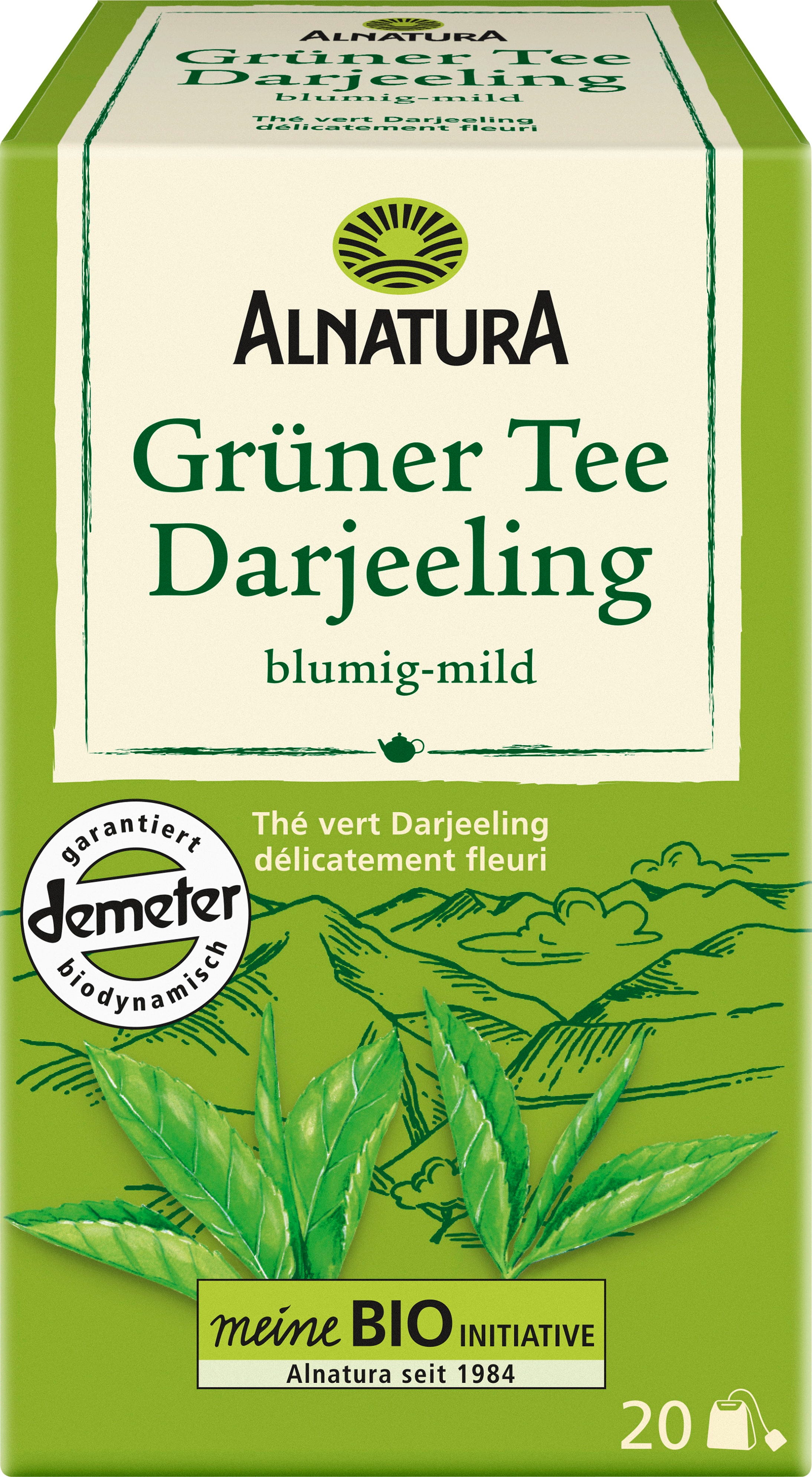 Nežen cvetlični okus je zaščitni znak bio zelenega čaja Darjeeling znamke Alnatura. Čajni lističi so obrani v severnoindijski regiji Darjeeling, kjer se v njihovi aromi prepletata svežina in moč narave. Čaj je pridelan biodinamično po smernicah Demeter. Zaradi visoke lege med 1.200 in 1.600 m rastlina raste počasi, kar ji pomaga razviti izjemno intenzivno aromo, ki bo zagotovo popestrila vašo skodelico čaja.