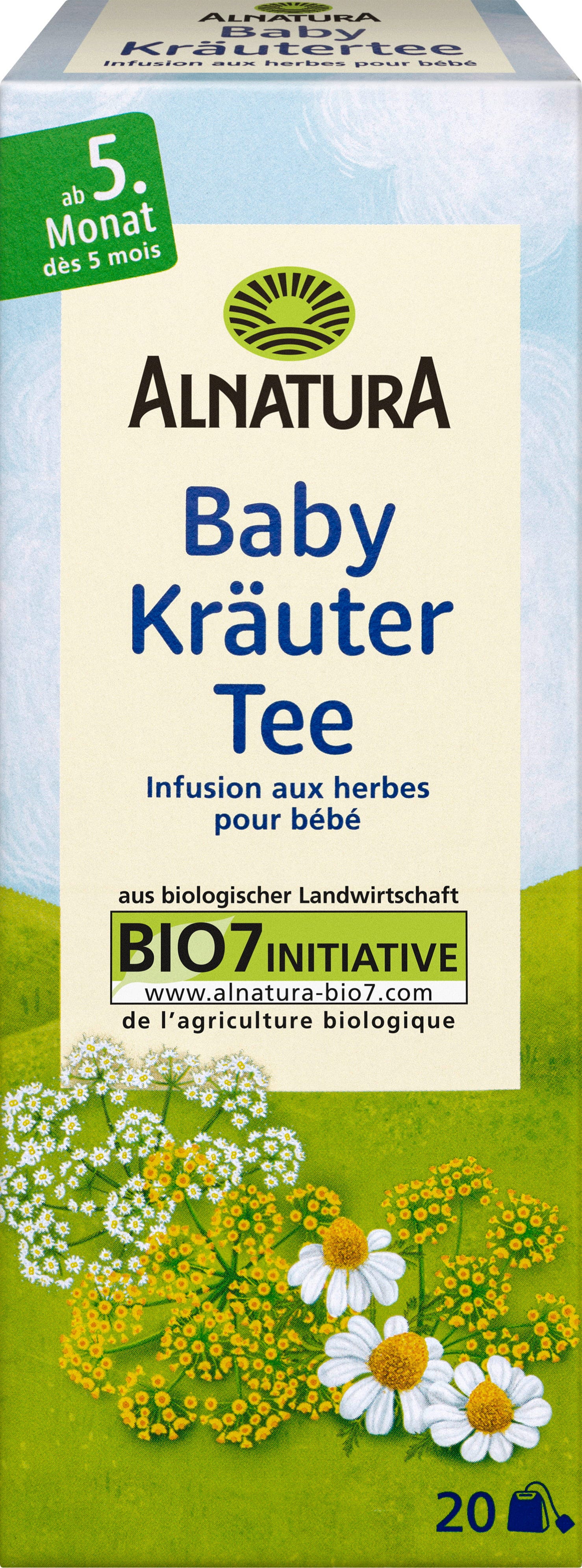 Blaga in harmonična zeliščna čajna mešanica Alnatura je zaradi sestavin, kot so komarček, kumina, limonska trava, kamilica in janež, idealna za dojenčke od 5. meseca starosti. Vse sestavine izvirajo iz ekološke pridelave.