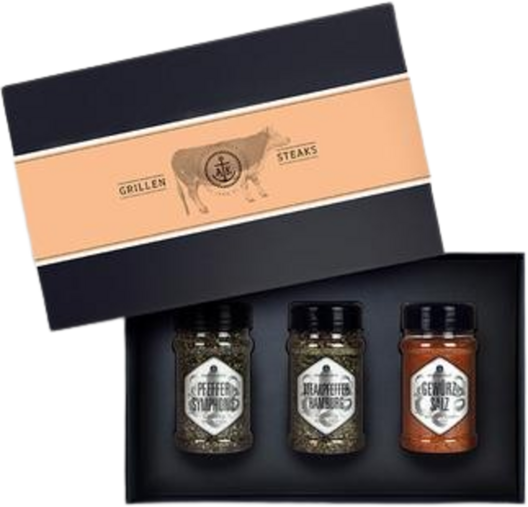 Set plemenitih začimb za popolno uživanje v zrezkih in steakih: dve mešanici popra in posebna začimbna sol v plemeniti, črni kartonski škatli z ekskluzivnim darilnim zavojem iz Ankerkraut.