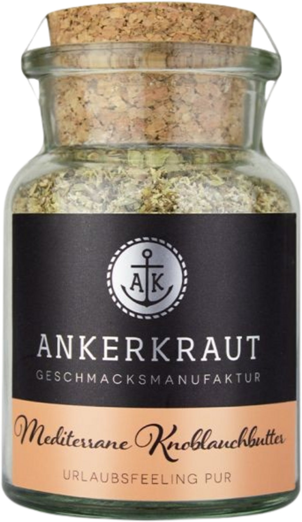 Česnovo maslo iz Ankerkrauta ima odličen okus na svežem zrezku ali na okusni bageti, pa tudi drugim obrokom daje piko na i. Klasična mediteranska zelišča, kot so origano, timijan, bazilika in rožmarin, dajo maslu okusen mediteranski okus.