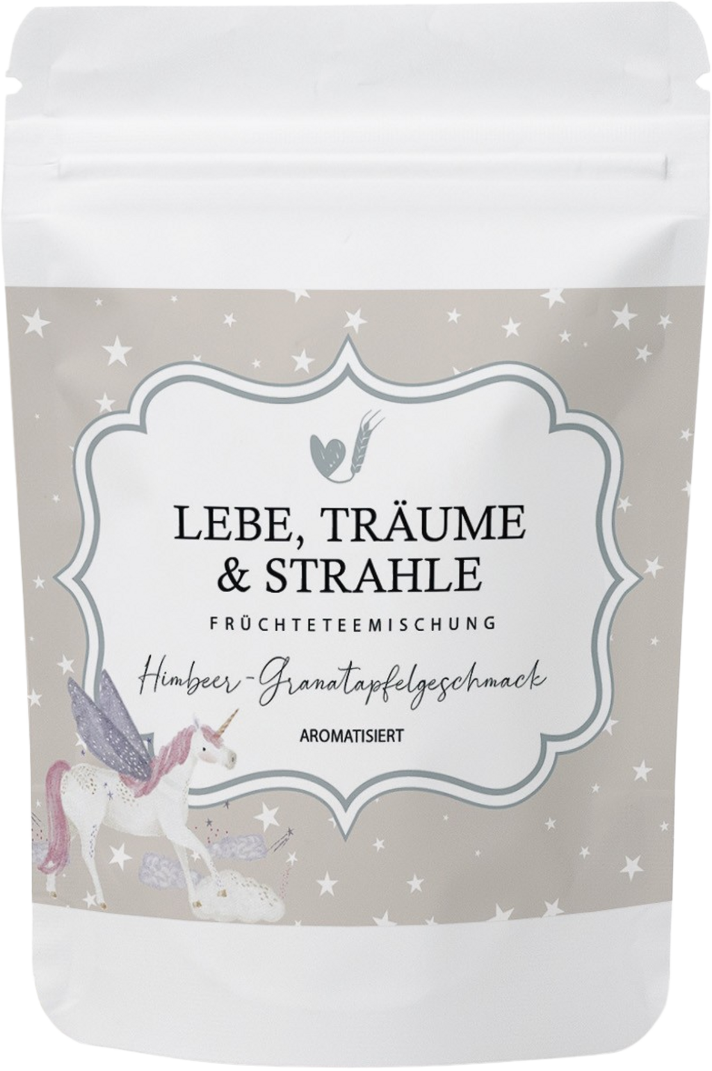 Čaj v vrečki z nemškim napisom, ki pomeni "Živi, sanjaj in sij", vsebuje aromatično kombinacijo koščkov jabolk, ananasa, zmajevega sadeža in jagodnih jogurtovih granul. Sadni okus maline in granatnega jabolka očara vsako skodelico. Idealno kot premišljeno darilo za ljubljene.