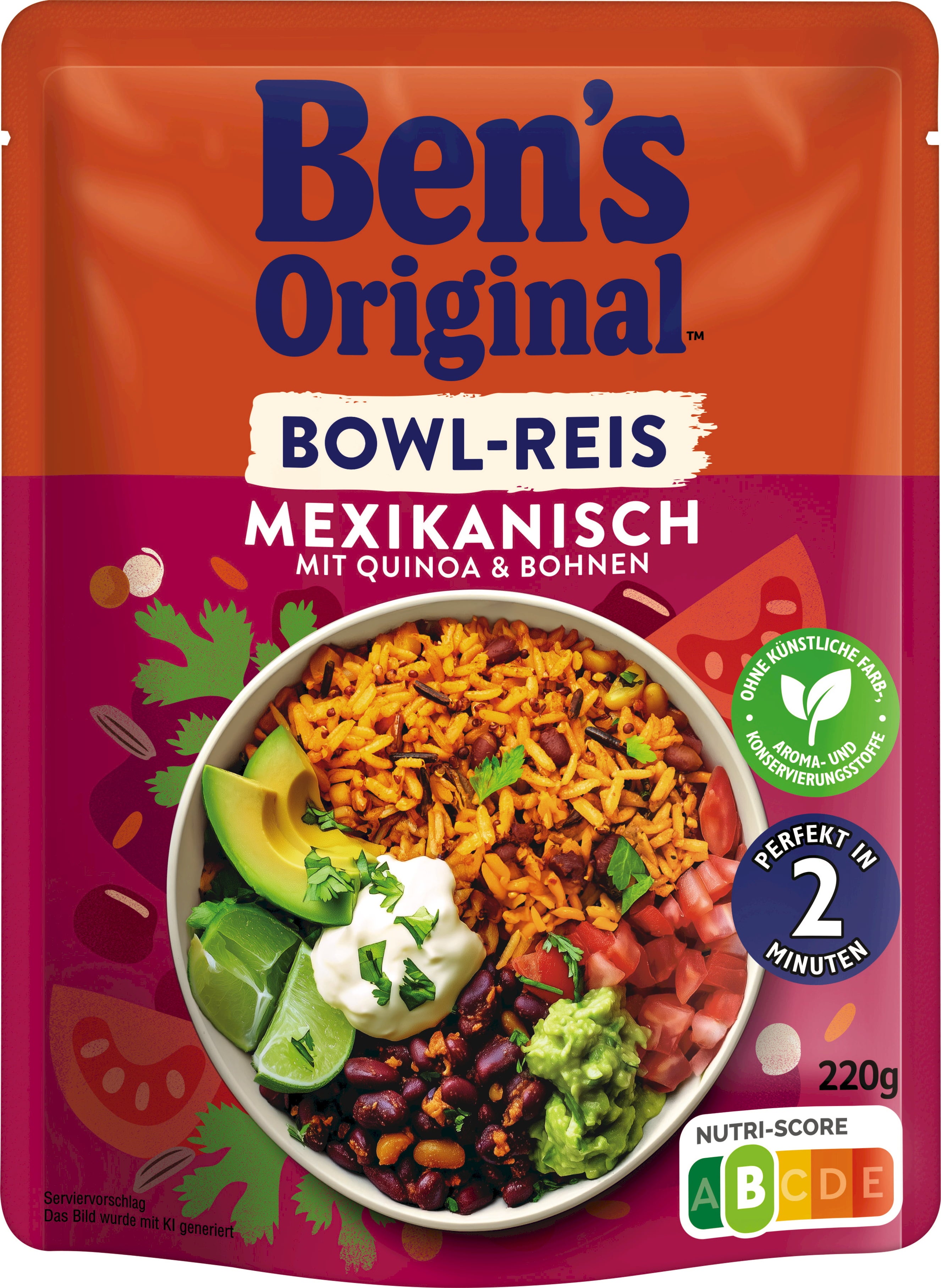 Z Express Bowl Rice - Mexican with Quinoa & Beans znamke Ben's Original ste idealno osnovo za vaše individualne kreacije. Uživajte v polnem okusu kombinacije riža, kvinoje in fižola, začinjene z izborom česna, čilija in drugih finih začimb.
