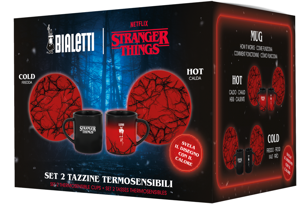 S kolekcijo "Stranger Things" postane priprava in pitje kave in drugih toplih napitkov posebna pustolovščina. Poleg fantastičnih motivov imajo vsi kosi termosenzibilne učinke, ki spreminjajo svoj videz, ko so napolnjeni s toplo tekočino, ali pa se v temi rdeče svetijo. Absolutni nepogrešljivi kosi za vse oboževalce kultne serije "Stranger Things" in seveda čudovito darilo.