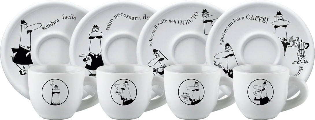 Komplet skodelic za espresso, ki je dekorativno oblikovan z ikoničnim Bialetti možičkom, na podstavkih prikazuje faze priprave kave.