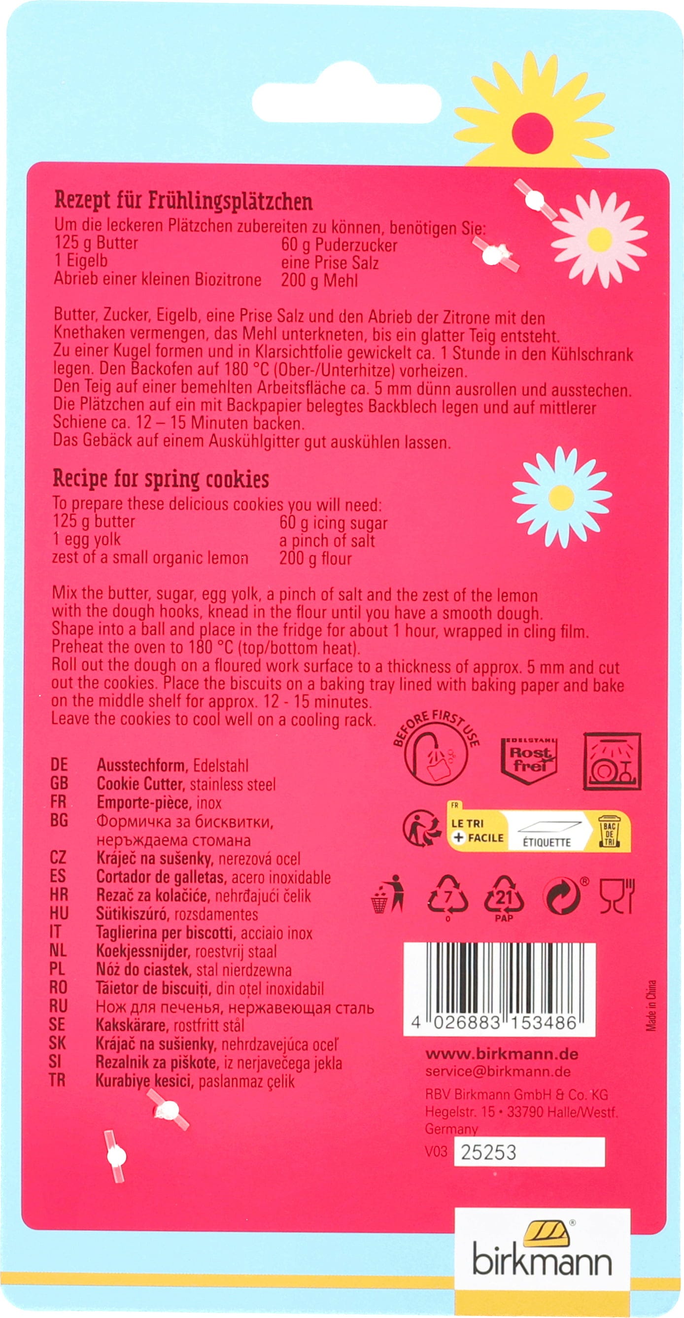 S tem velikonočnim XXL modelčkom za piškote znamke Birkmann boste v trenutku pričarali praznično vzdušje na svoji mizi! Visokokakovostno nerjaveče jeklo brez truda drsi skozi testo in zahvaljujoč natančni izdelavi pušča izjemno čiste robove, tako da vaš ljubki velikonočni zajec ohrani svojo popolno obliko.