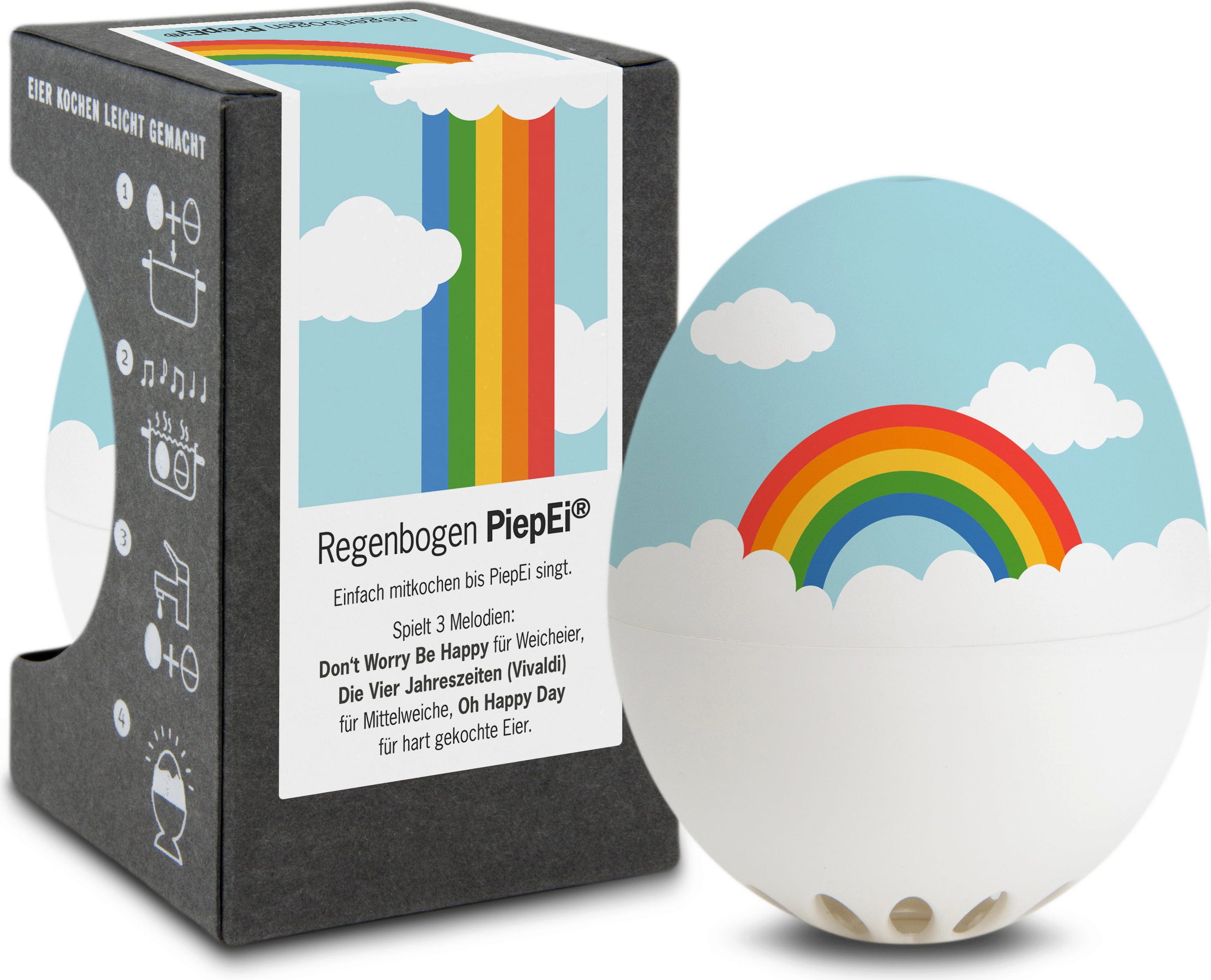 Preprosto postavite merilnik za kuhanje jajca Rainbow PiepEi v vodo skupaj z jajci in počakajte, da se začne predvajati melodija želene stopnje kuhanih jajc. Naprava deluje ne glede na začetno temperaturo vode, velikost jajc ali nadmorsko višino kuhanja.
