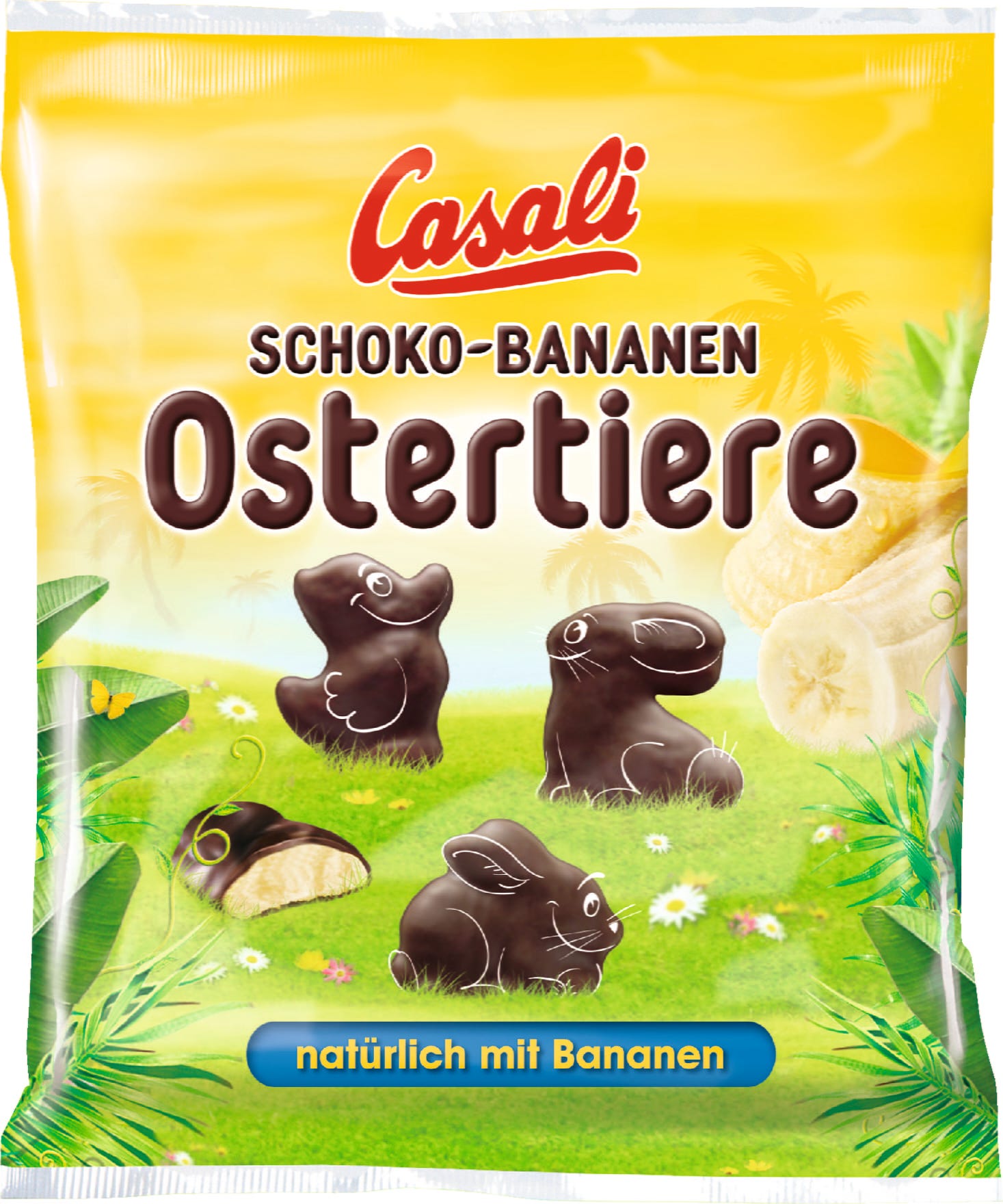 Casalijeve čokoladno-bananine velikonočne živali združujejo gladko čokolado s sadno bananino peno za poslastico, ki si je takoj zaželite še več. Pena, narejena iz pravega bananinega pireja, ponuja naraven, poln okus po banani. Skrbno izbrane sestavine zagotavljajo, da vsaka figurica postane sladka mala velikonočna poslastica. Pravilno shranjene velikonočne živali ostanejo sveže dlje časa in ohranijo svojo mehko, aromatično teksturo.
