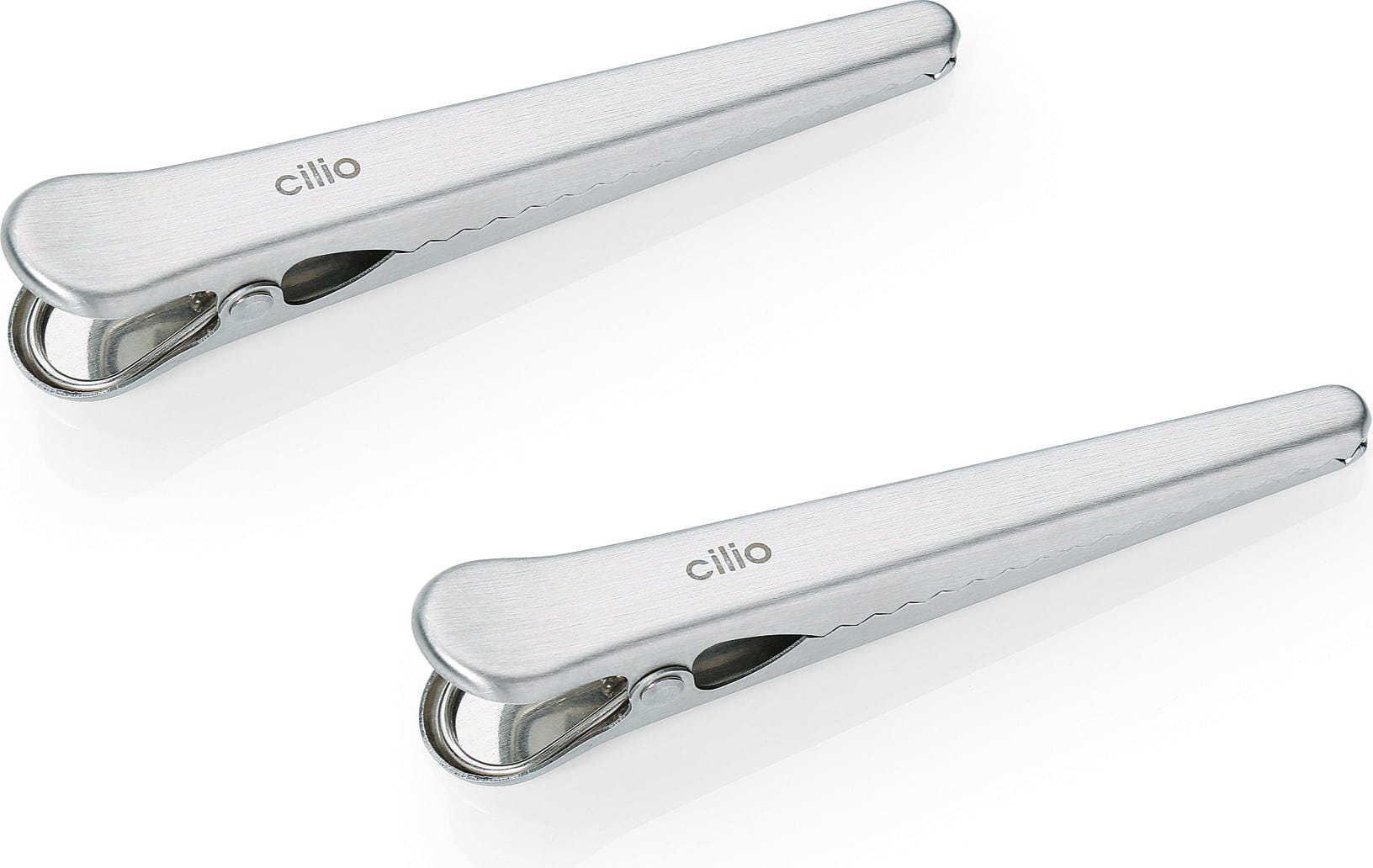 Zaščitite kavna zrna ali mleto kavo pred vlago in izgubo arome na eleganten način. S kompletom dveh sponk za kavne vrečke znamke cilio izberete funkcionalen dodatek, katerega minimalistična oblika se bo podala v vsako moderno kuhinjo. Zaradi robustne zasnove iz nerjavečega jekla sta ti dve sponki trajnostna alternativa krhkim plastičnim sponkama.