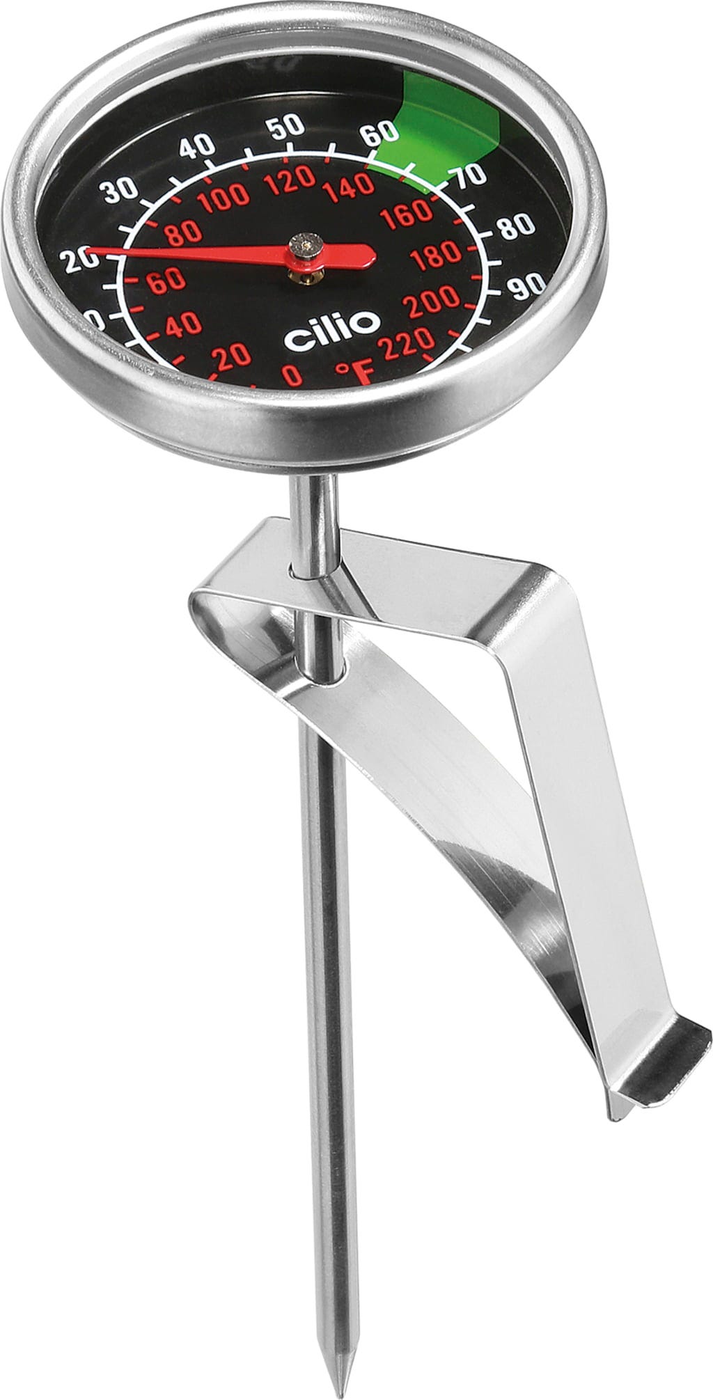 S termometrom za mleko znamke cilio iz visokokakovostnega nerjavečega jekla lahko zanesljivo preprečite, da bi se mleko pregrelo, kar bi uničilo okus in konsistenco. Dolga merilna igla se odziva hitro in natančno, tako da lahko postopek penjenja ustavite v pravem trenutku. Fleksibilna pritrdilna sponka se odlično prilagaja različnim višinam lončkov.
