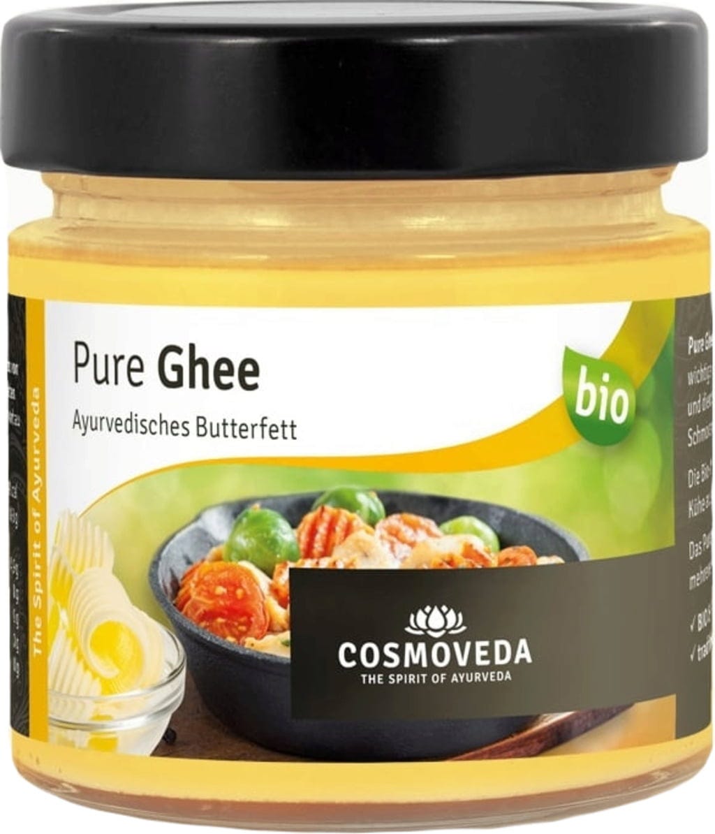COSMOVEDA Ghee je pomemben sestavni del Ayurvedske kuhinje. Krepi prebavo (Agni) in Ayurveda Ojas (življensko energijo). Jedi pripravljene z ghee-jem so izredno lahke za absorbcijo. Zaradi svoje posebne priprave ima ghee tudi brez hlajenja primerno dolgi rok uporabe.
