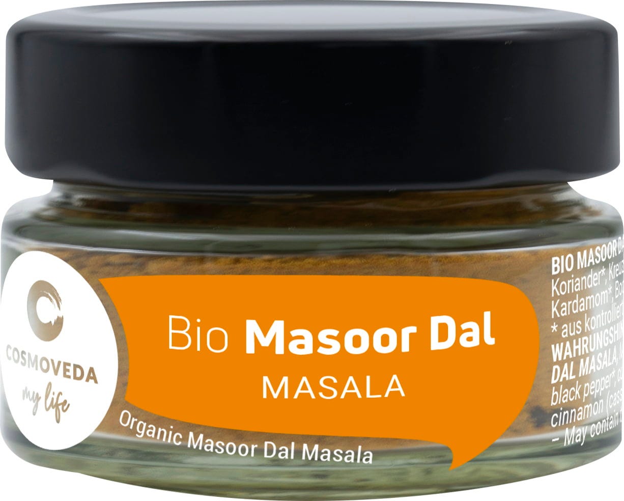 COSMOVEDA BIO masoor dal masala specialno uravnotežena ayurvedska mešanica skrbno izbranih začimb za pripravo oksunega in lahko prebavljivega masoor dala.