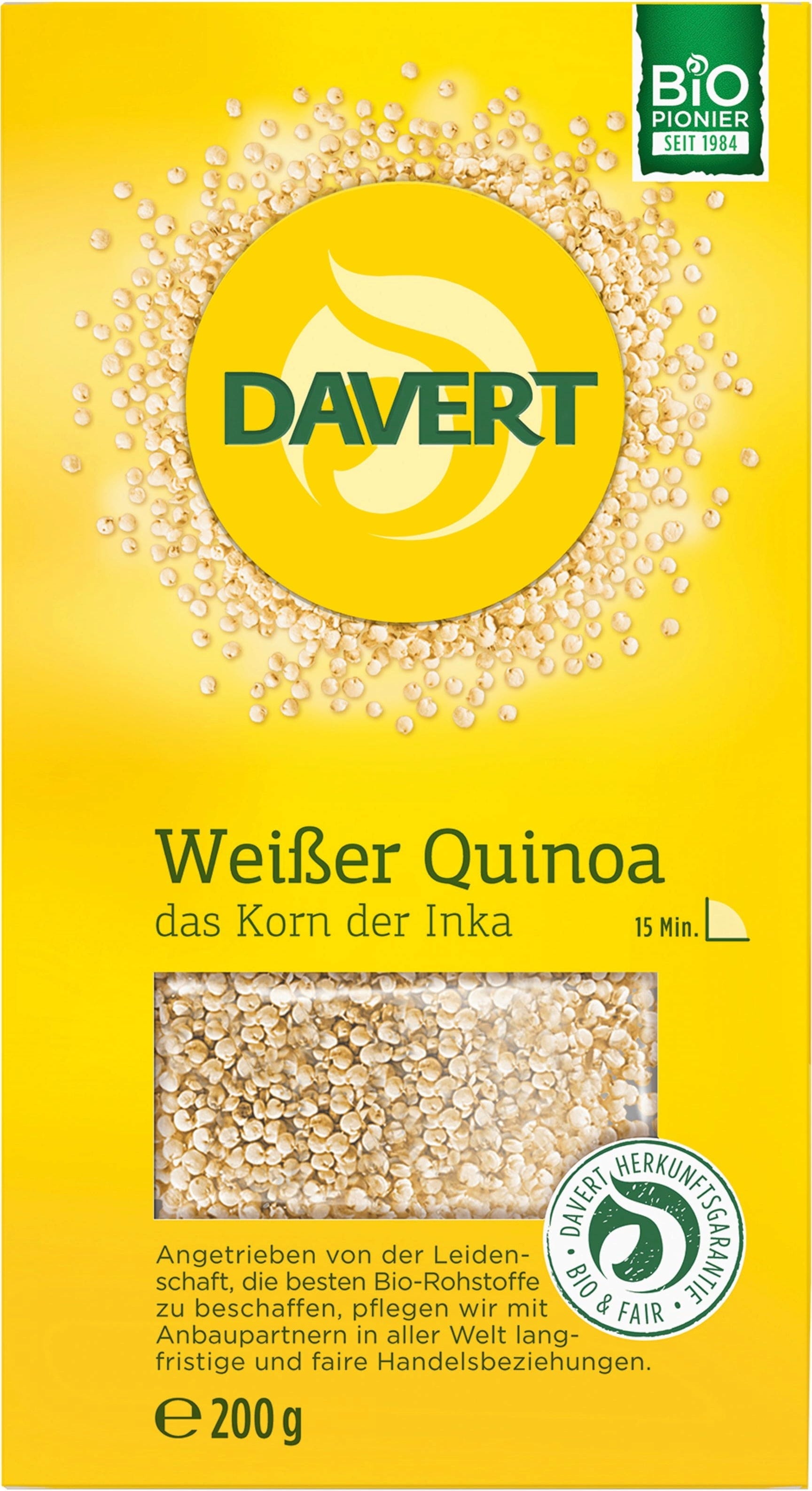 Bio bela kvinoja znamke Davert je najfinejša med vrstami kvinoje in navdušuje s posebej blagim, diskretno oreškastim okusom. Majhna bela zrna so pravi mojstri preobrazbe: po kuhanju ostanejo čudovito rahla in zrnata, medtem ko popolno vpijejo arome svežih zelišč in začimb.