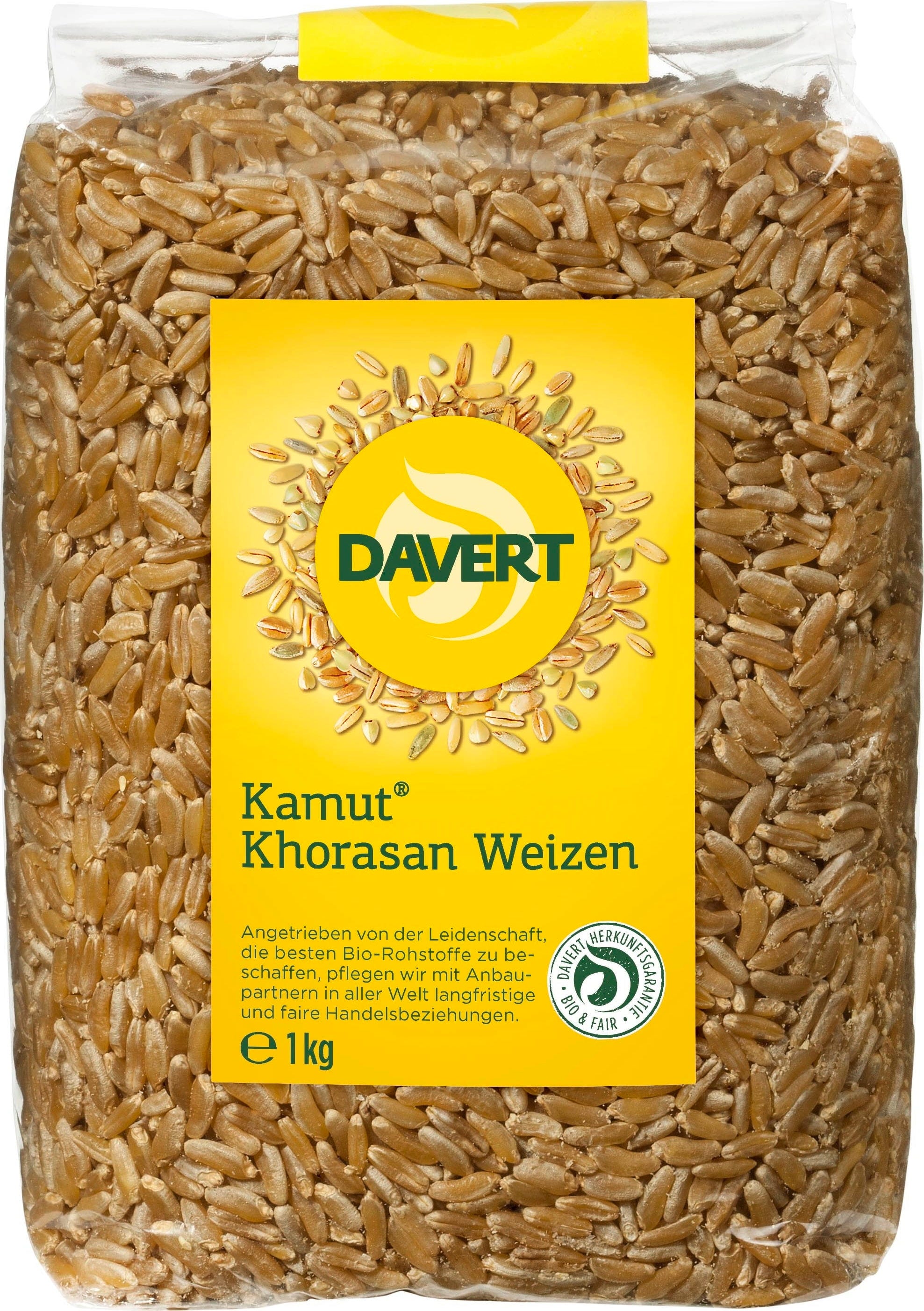 Bio kamut znamke Davert (Khorasan pšenica) je starodavna, ponovno odkrita vrsta, ki navdušuje s svojo impresivno velikostjo zrn in izjemno aromo. Oreškasto-sladkast okus naredi to žito za pravo gurmansko doživetje v bio kuhinji.