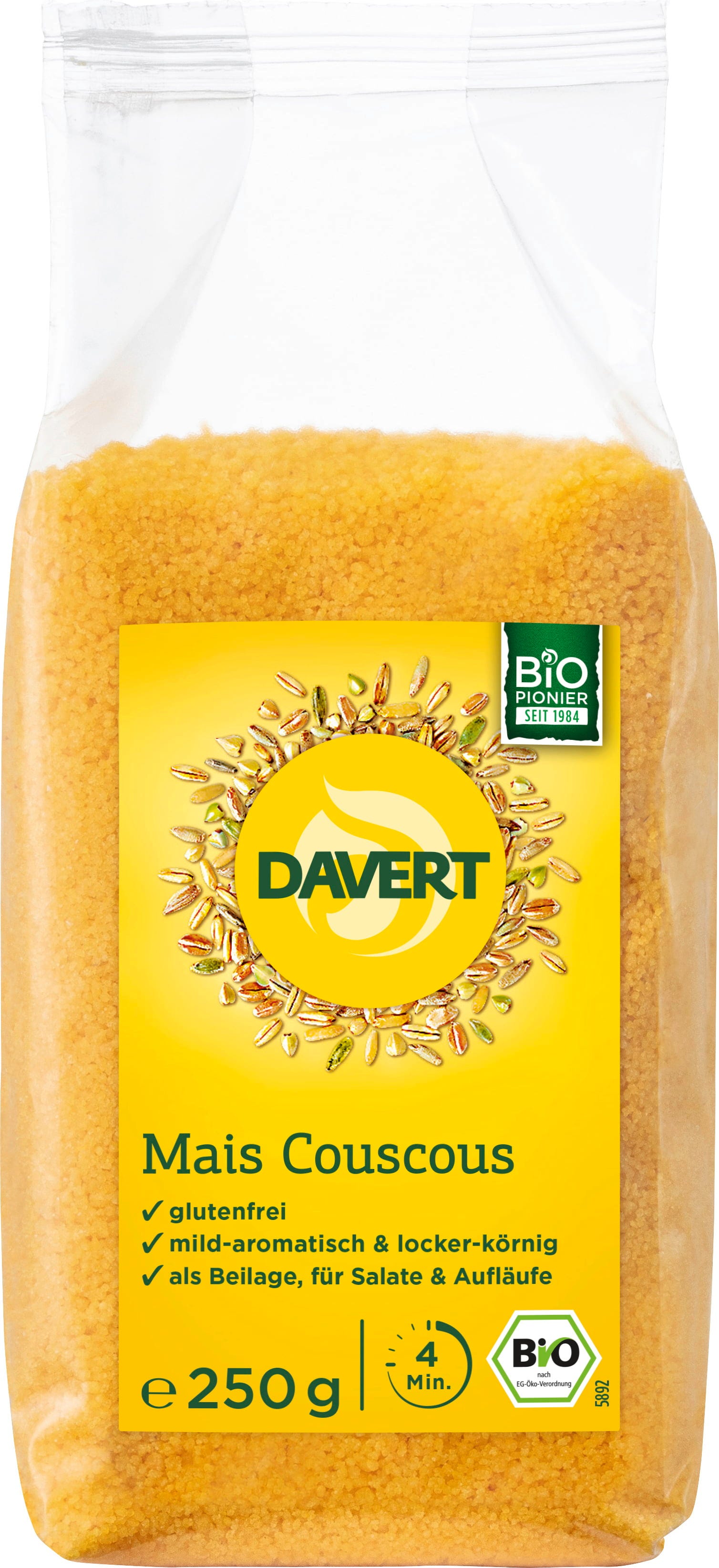Bio koruzni kuskus znamke Davert je popolna rešitev za vse, ki iščete rahlo in zrnato alternativo. Sestoji iz 100 % koruze in prepriča s svojo blago aromo. Naj bo kot osnova za brezglutenski taboulé, kot hitra priloga k začinjenim jedem iz ponve ali kot zanimiva sestavina v narastkih: ta zlatorumeni bio kuskus je pravi vsestranski talent.