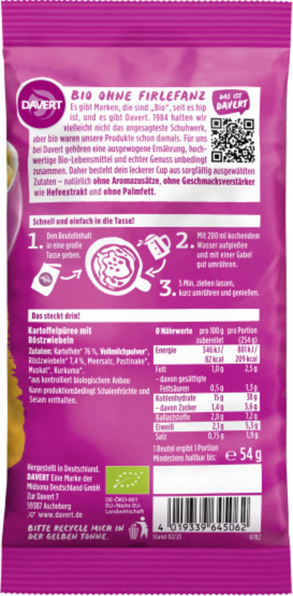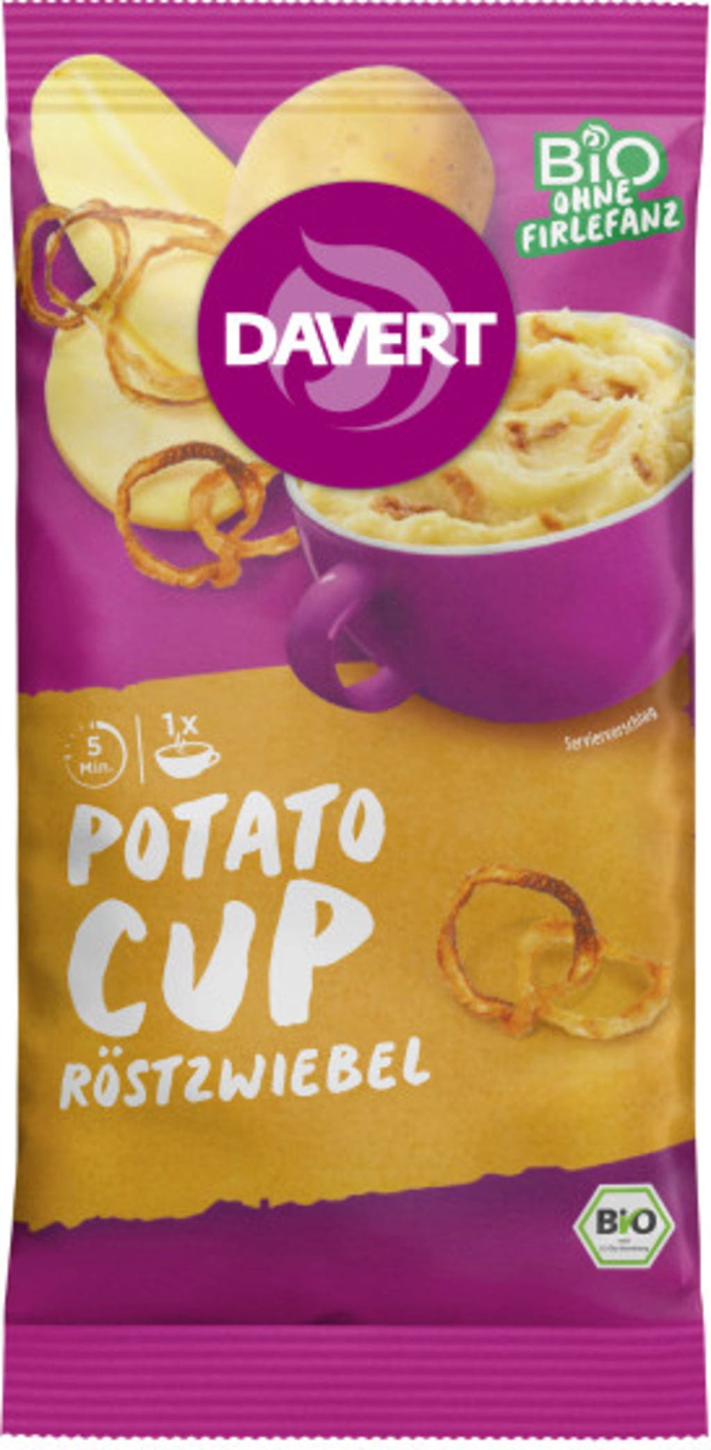 Si želite pravo hrano za dušo v rekordnem času? Z bio krompirjevim pirejem s praženo čebulo znamke Davert si lahko kremast obrok privoščite kar v svoji najljubši skodelici. Za polno aromo poskrbijo začinjena pražena čebula, fin pastinak in ščepec kurkume.