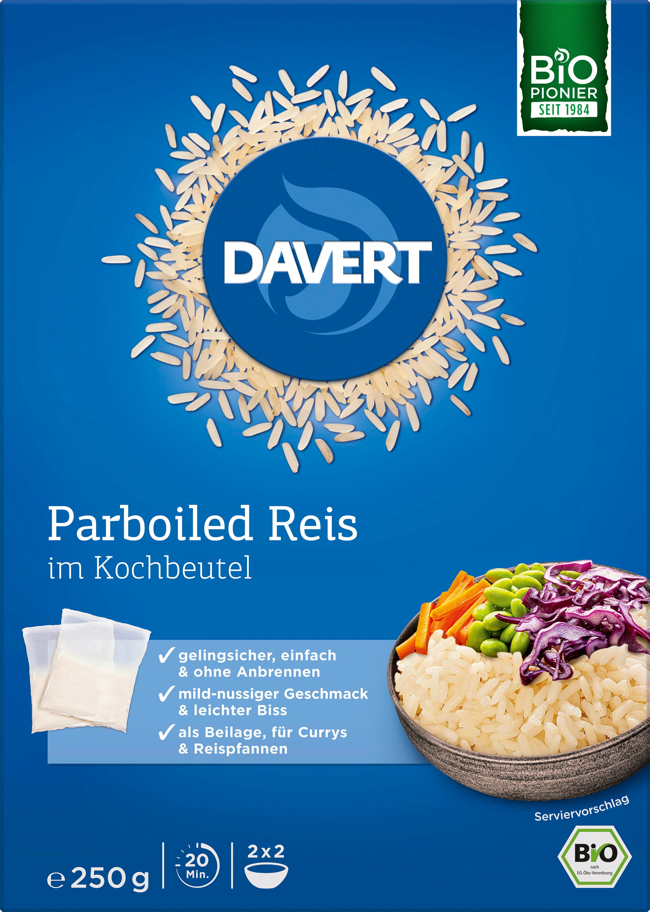 Bio parboiled riž v vrečki za kuhanje znamke Davert je popoln spremljevalec vaše bio kuhinje! S posebnim parboiling postopkom se ohranijo vse dragocene sestavine. Rezultat je čudovito zrnat riž z rahlim ugrizom, ki se ne sprijema in ne prismodi.