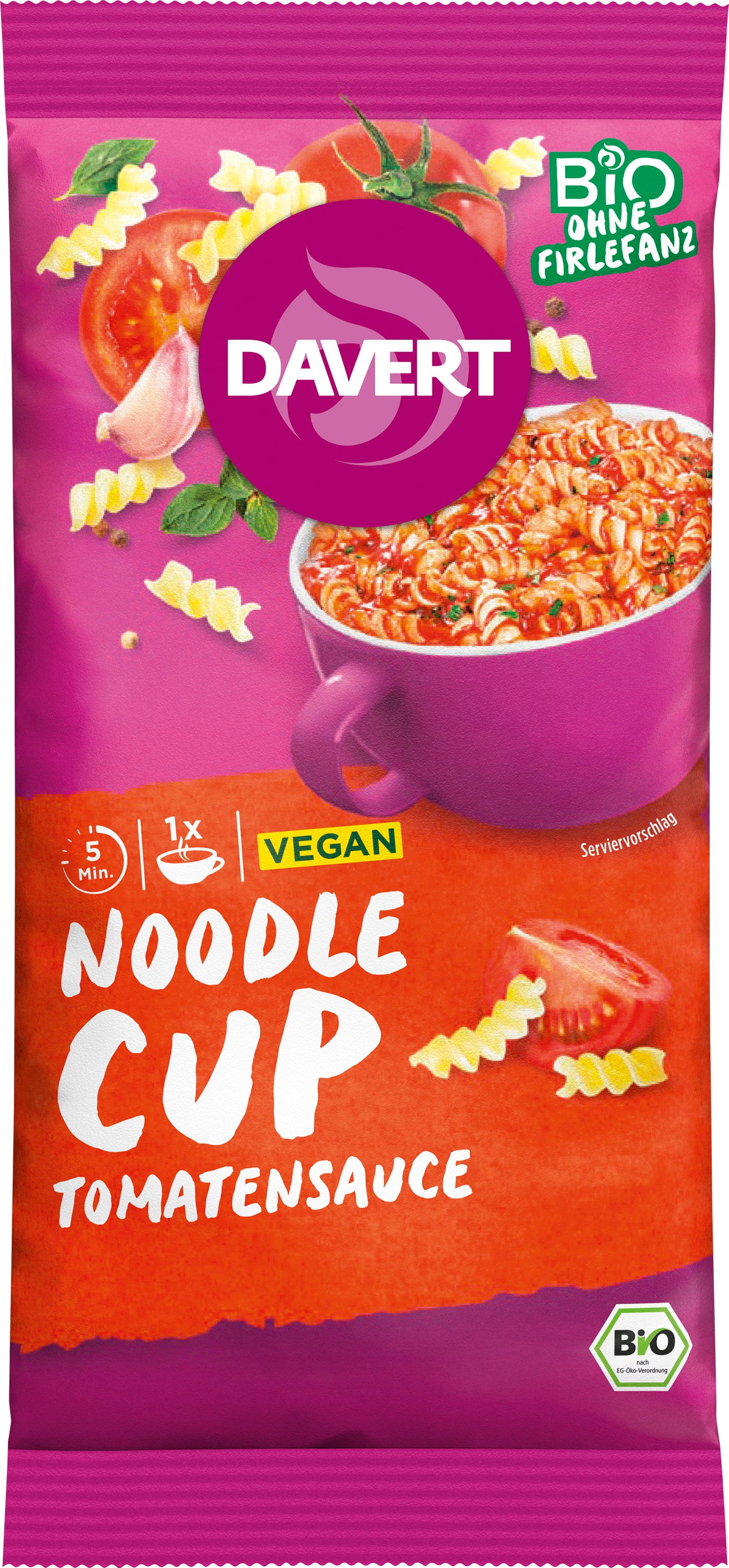 Uživajte v pristnem italijanskem okusu kar iz svoje najljubše skodelice! Bio testenine s paradižnikovo omako znamke Davert združujejo kakovostne rezance iz pšenice durum in bogato, krepko začinjeno paradižnikovo omako. Zelišča, kot je origano, in ščepec česna pričarajo poln okus klasične pašte – in to povsem brez kuhanja!