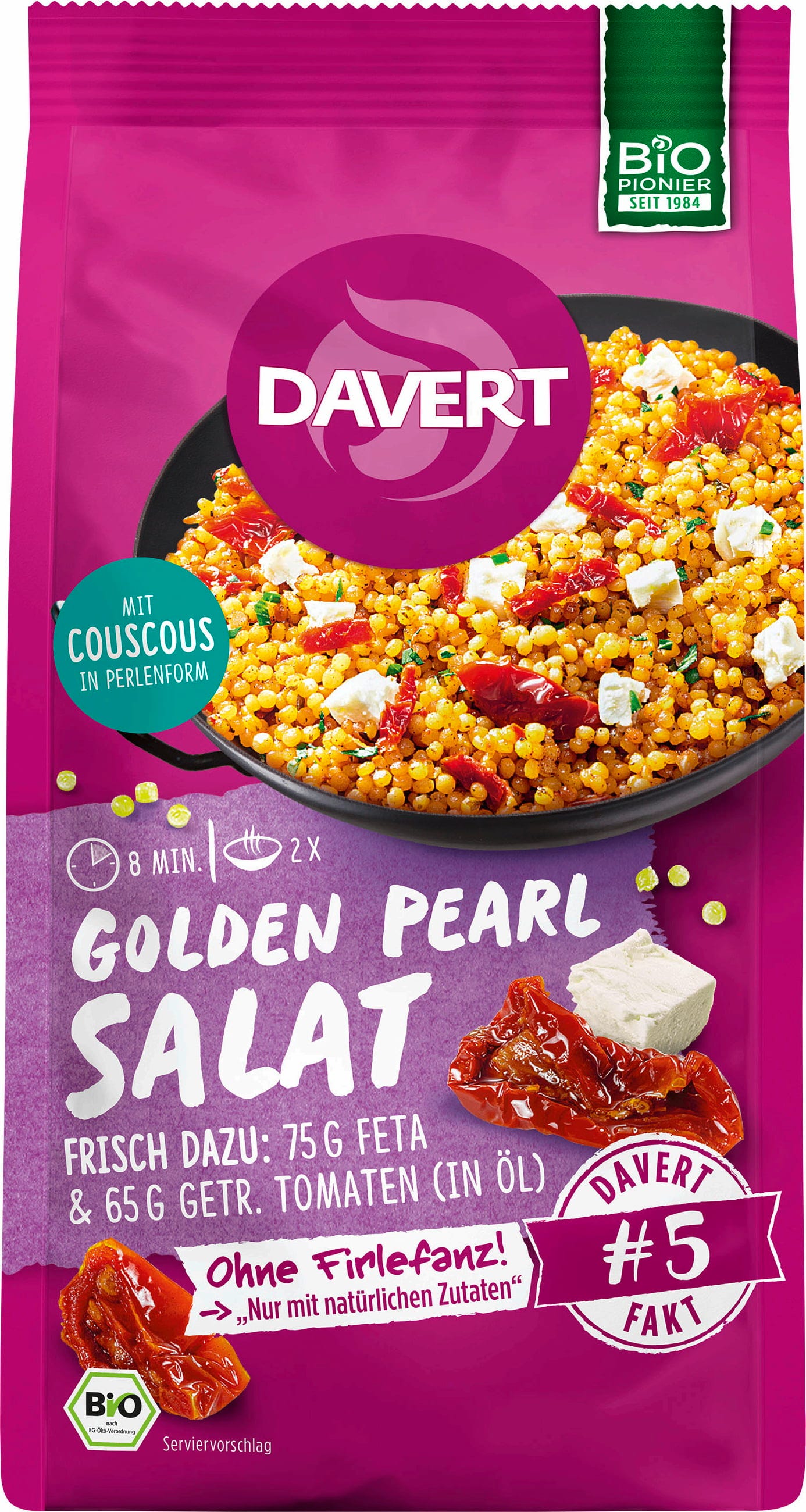 Pričarajte si mediteransko doživetje v samo osmih minutah! Plemenit kuskus v dekorativni perlasti obliki tvori osnovo za to Bio solato Golden Pearl znamke Davert, ki navdušuje z izborom orientalskih začimb.