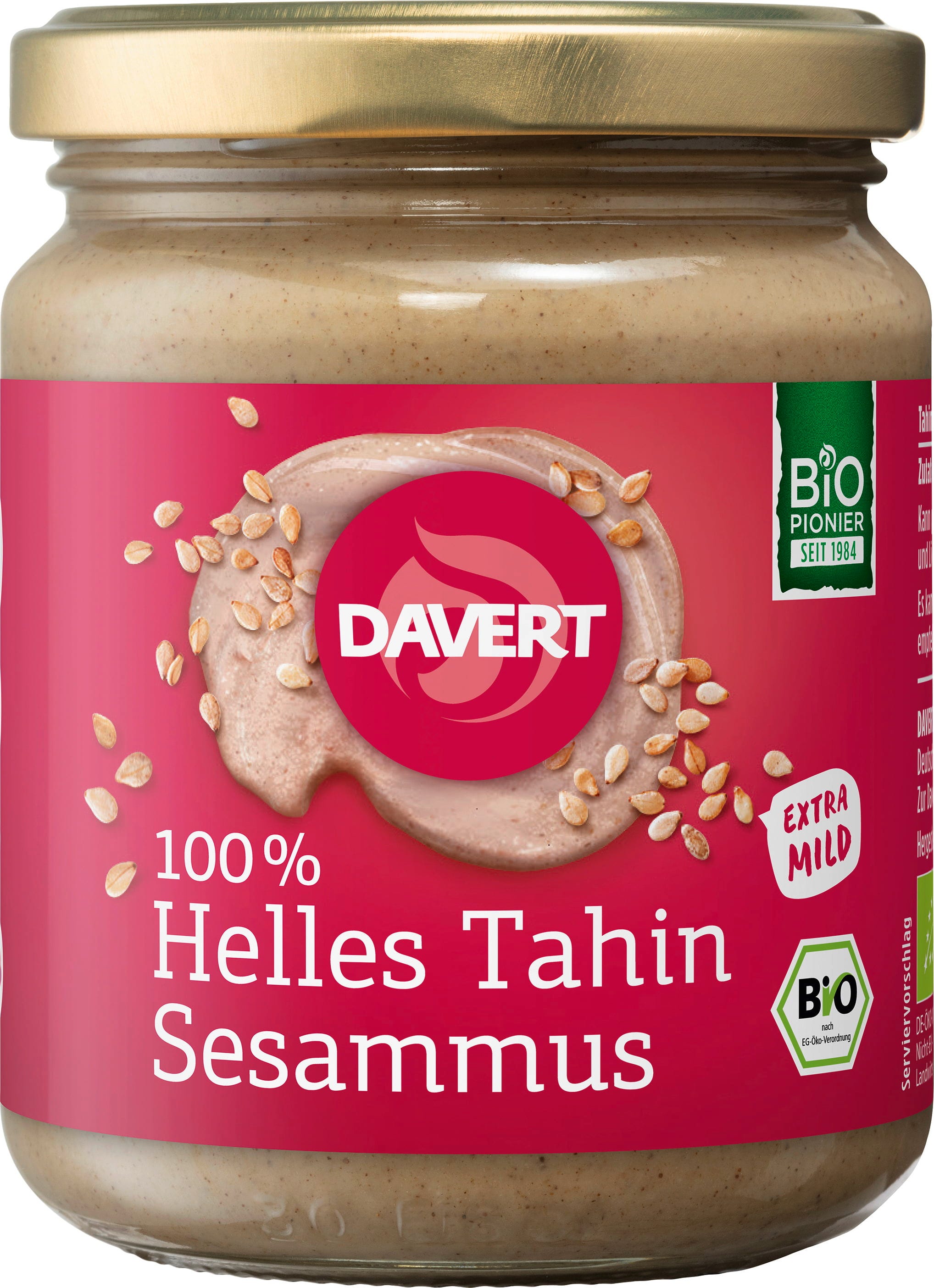 Odkrijte blago raznolikost orienta za svojo kuhinjo! Bio svetel tahini – sezamovo maslo znamke Davert sestoji iz 100 % oluščenega bio sezama, ki je pražen brez maščobe in predelan v svilnato fino maslo. Zahvaljujoč svoji izjemno blagi aromi je pravi vsestranski talent: humusu in pomakam daje klasično kremastost, obogati prelive in omake ali pa služi kot oreškast posip za sklede in sadje.
