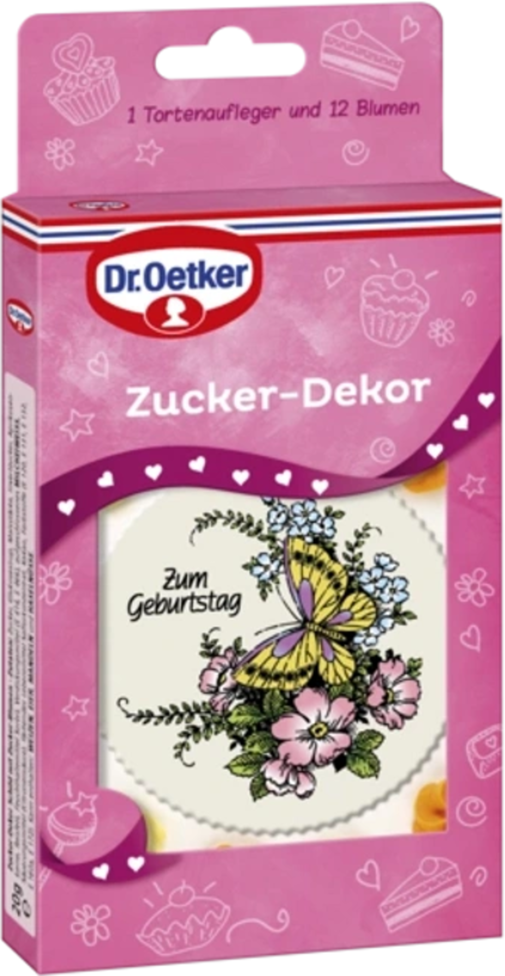 Sladkorni dekorativni okras Dr. Oetker takoj navduši vse ljubitelje tort. Užitni okrasi so idealni za različne rojstnodnevne torte. Paket vsebuje 1 sladkorni okrasni znak in 12 sladkornih rožic.
