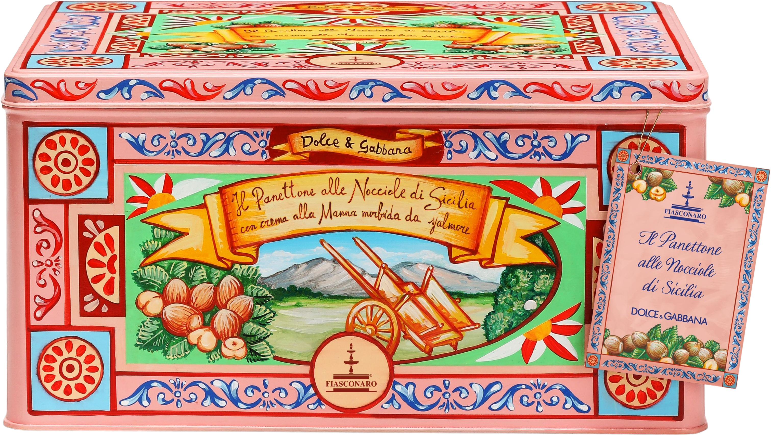 Panettone in manna krema sta pakirana v čudoviti, pisani kovinski škatli iz ekskluzivne linije Dolce & Gabbana znamke Fiasconaro. Poleg torte in kreme je priložen tudi priročen, privlačen nož za mazanje.