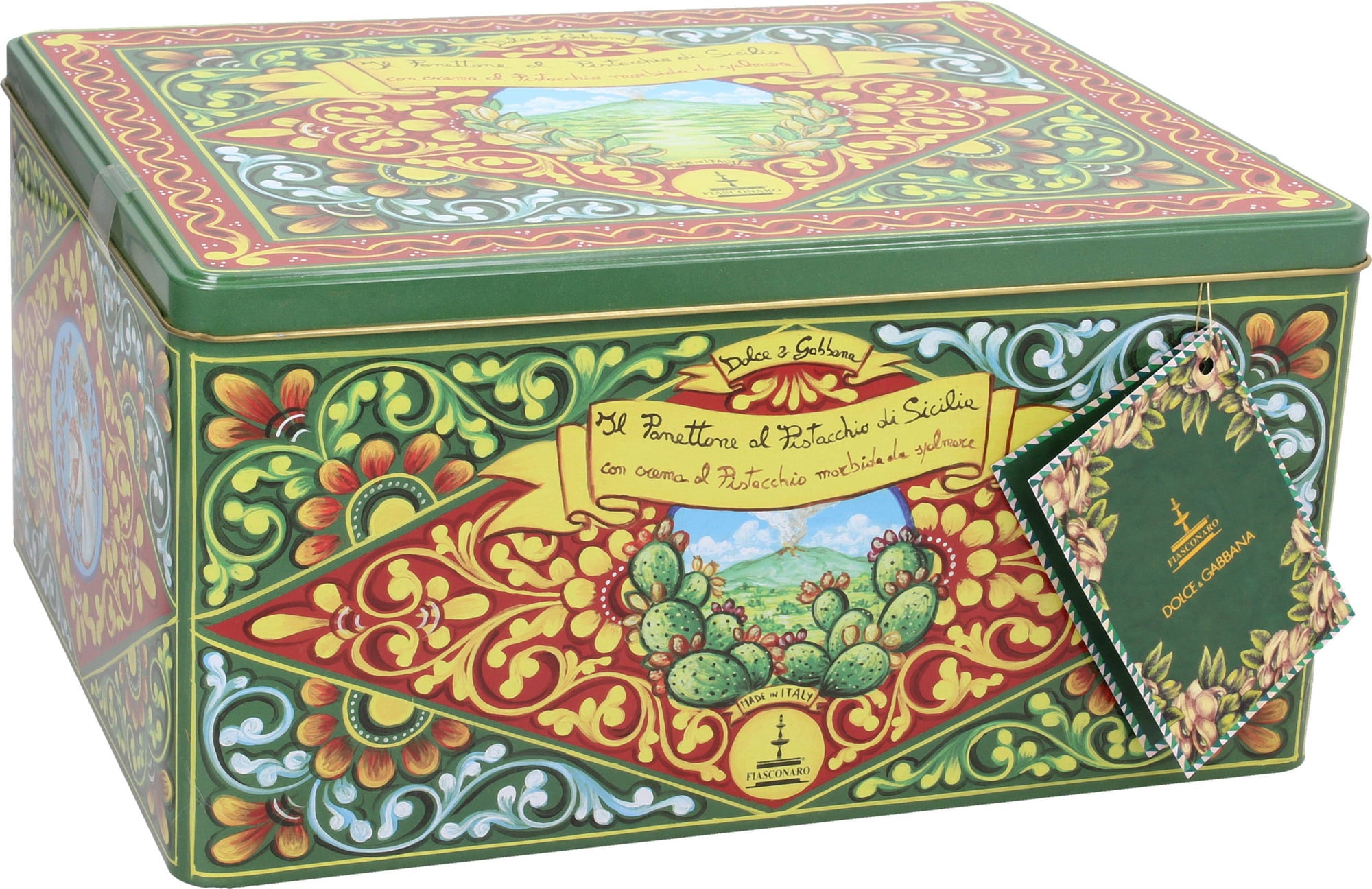 Čudovita kovinska škatla v ekskluzivnem dizajnu Dolce & Gabbana vsebuje pravo specialiteto iz Fiasconara: puhast, sočen panettone, prekrit z velikodušno glazuro iz bele čokolade in hrustljavih celih pistacij. Za popoln užitek je na voljo tudi kozarec okusne kreme iz pistacije Fiasconaro, s katero lahko pravi sladkosnedi namažejo svoj kos torte – v pravem slogu s čudovito izdelanim nožem, ki je v kompletu.