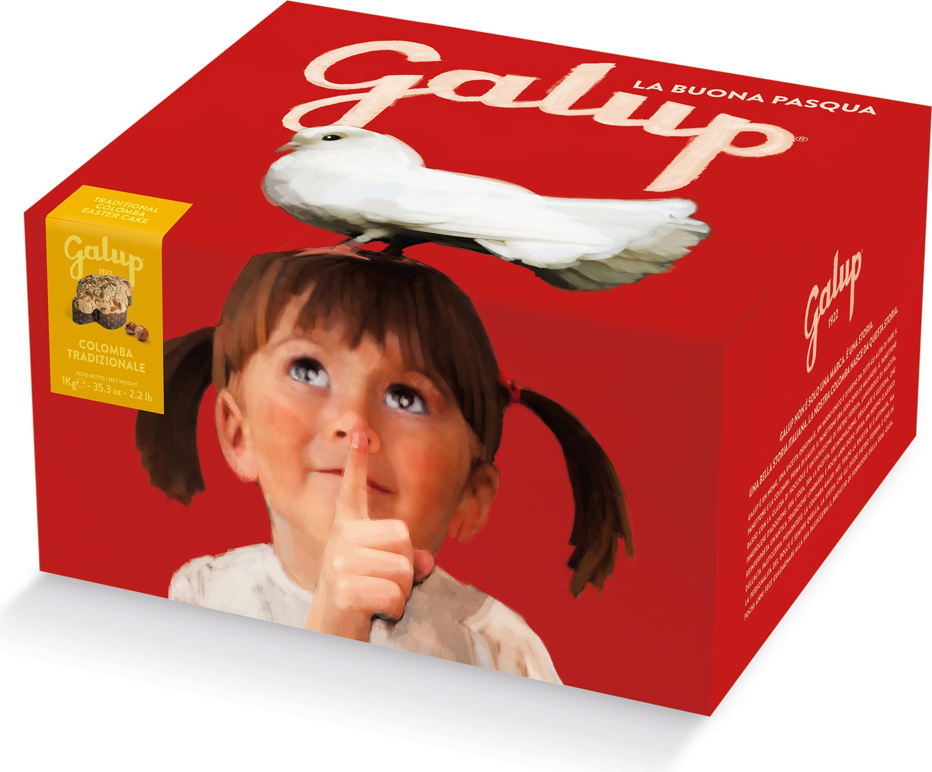 Ta klasična Colomba znamke Galup prinaša italijansko velikonočno tradicijo naravnost na vašo mizo – z mehkim, naravno fermentiranim kvašenim testom in kandirano pomarančo za sadno aromo. Bogata lešnikova glazura, celi mandlji in sladkorni posip dodajo hrustljavo sladkost in pristen okus.