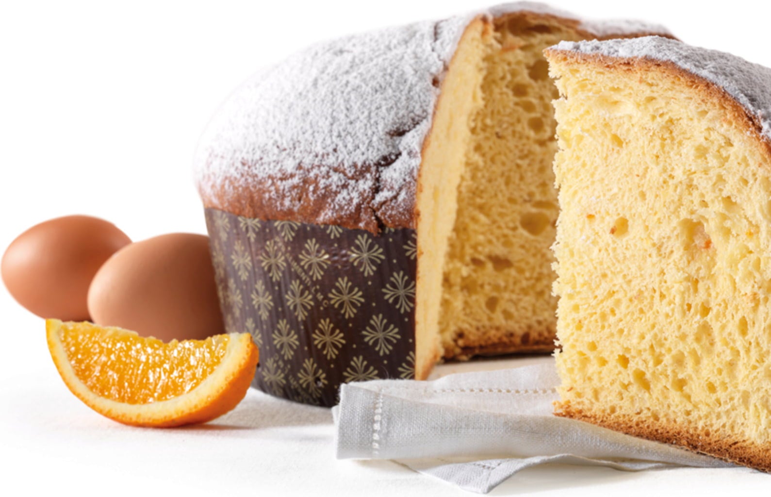 Ta nebeški panettone je okronan z obilnim posipom sladkorja v prahu, ki pecivu daje mamljivo sladkost - popoln dodatek za praznične priložnosti!