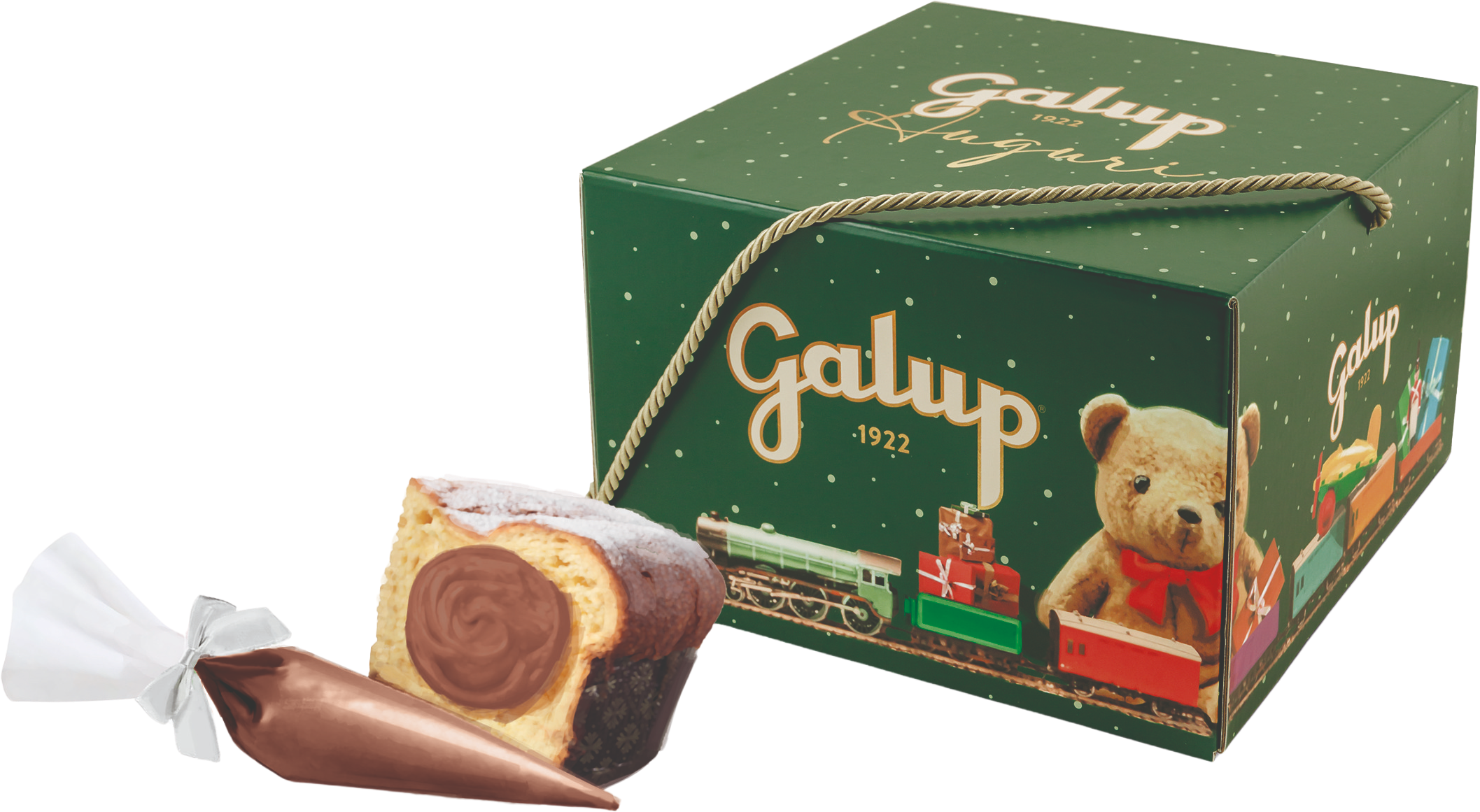 Posebnost tega panetona je hrustljava krema iz kakava in lešnikov, priložena v priročni vrečki za brizganje, s katero lahko paneton okrasite popolnoma po svojem okusu.