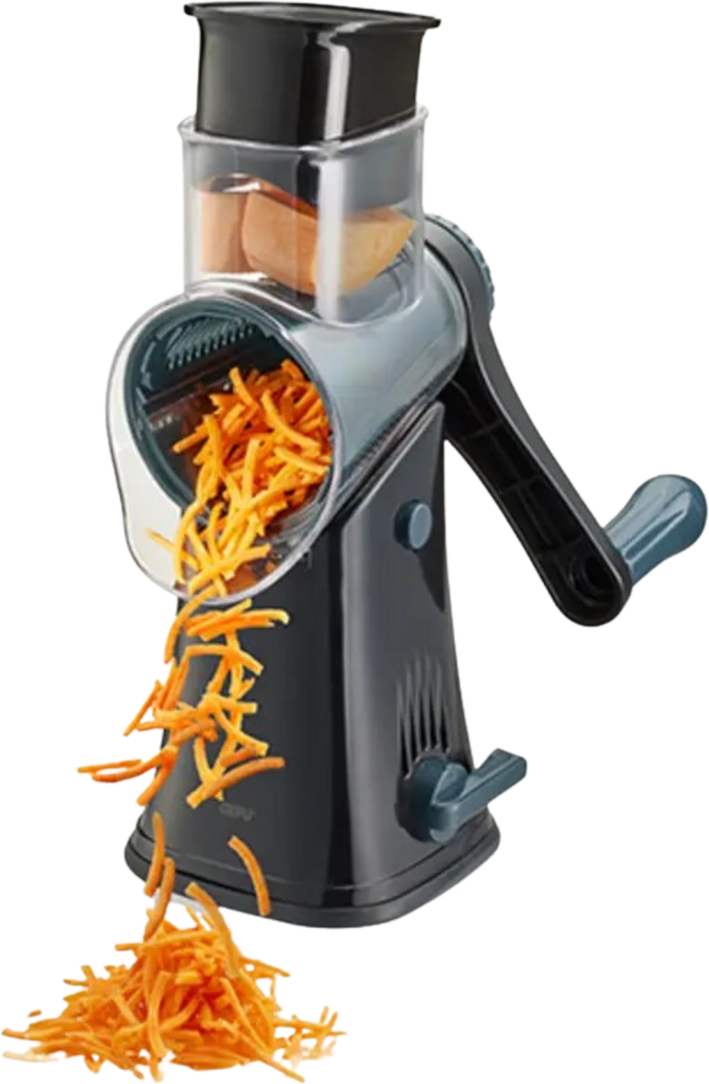 Preprosto vstavite želeni rezalni nastavek v boben, začnite vrteti in takoj boste dosegli čudovito enakomerne rezultate. Nedrseča vakuumska sesalna osnova zagotavlja stabilnost med vrtenjem. Visoka osnova omogoča, da pod njo postavite višje posode. Priložen je potiskalnik za varno potiskanje sestavin skozi boben. Ohišje je izdelano iz robustne plastike in visokokakovostnega nerjavečega jekla, zato je čiščenje enostavno. Prejeli boste tudi praktično škatlo za shranjevanje rezilnih nastavkov.