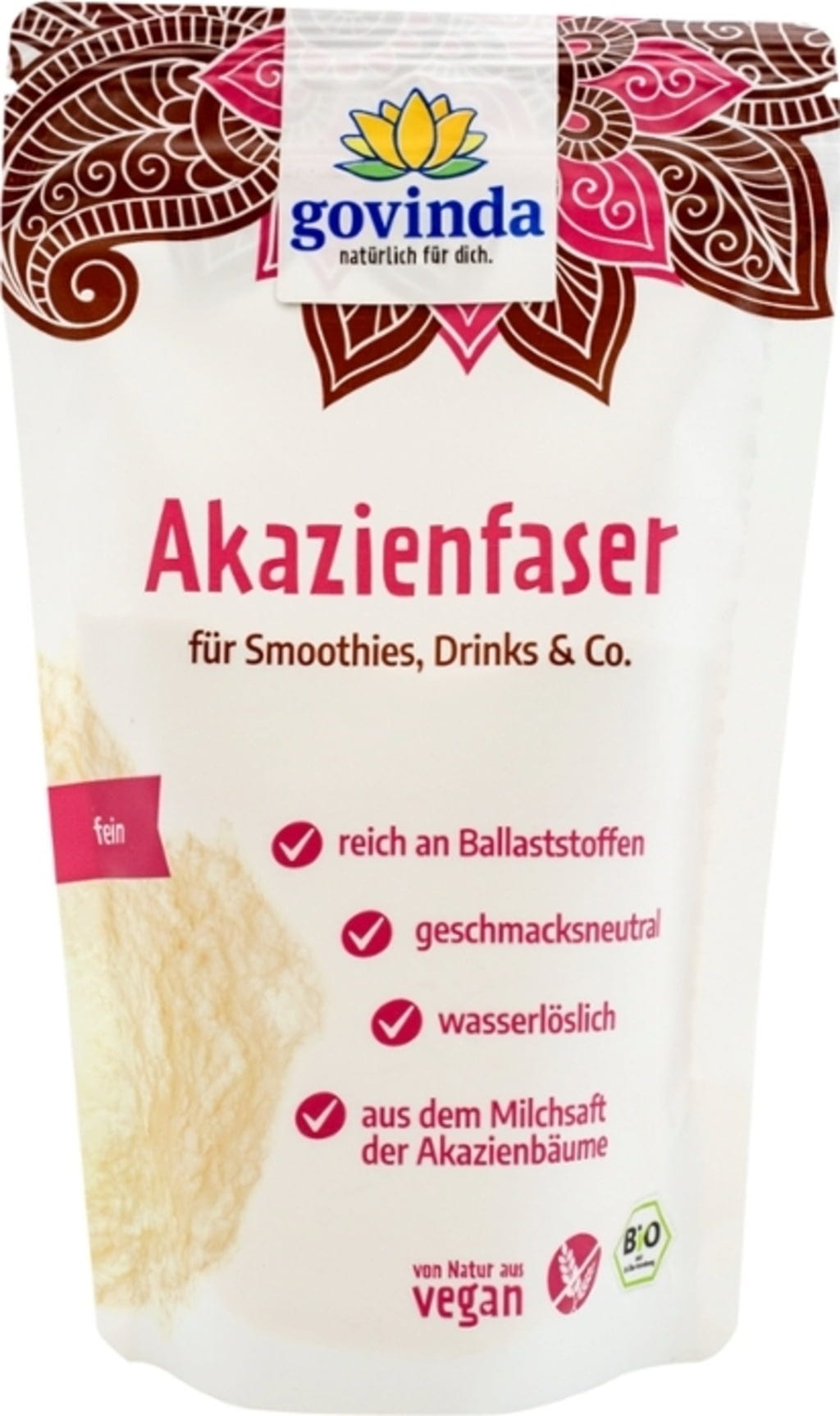 Akacijeva vlakna znamke Govinda so pridobljena z nežnim sušenjem mlečnega soka divje rastočih akacij. Fini prah je nevtralnega okusa in se idealno vmeša v pijače, smoothie ali vsakodnevne müslije. Ker gre za vodotopno vlaknino, ostane konsistenca vaših jedi nespremenjena. Visokokakovostno prehransko dopolnilo iz certificirane bio pridelave je popolnoma brez umetnih dodatkov.
