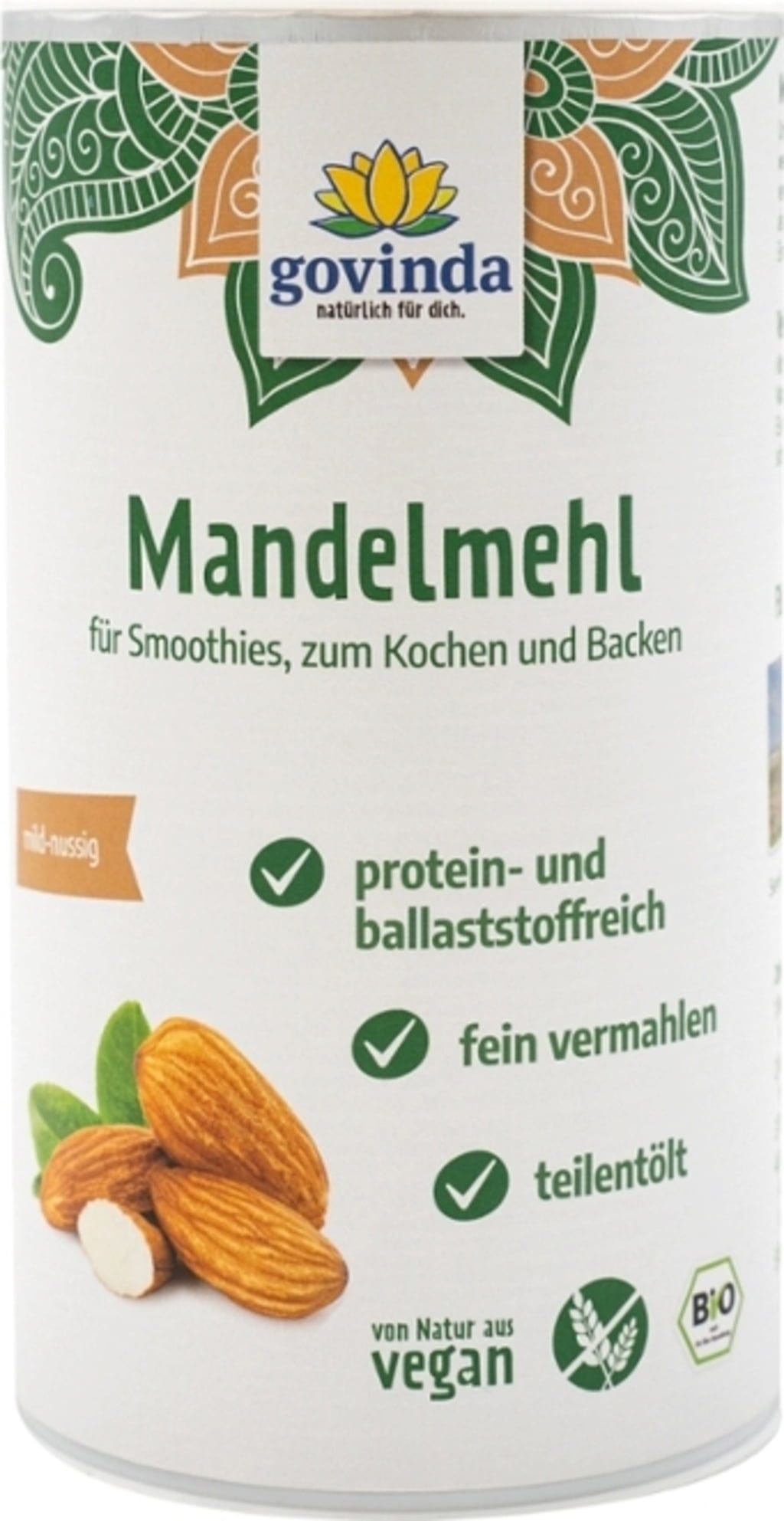 Mandljeva moka se pridobiva iz zrelih plodov mandljevega drevesa s hladnim stiskanjem. Prešana pogača (osnova mandljeve moke) je zdaj delno razmaščena in fino zmleta. Za pripravo Govindine mandljeve moke se uporabljajo le izvrstni sladki mandlji.