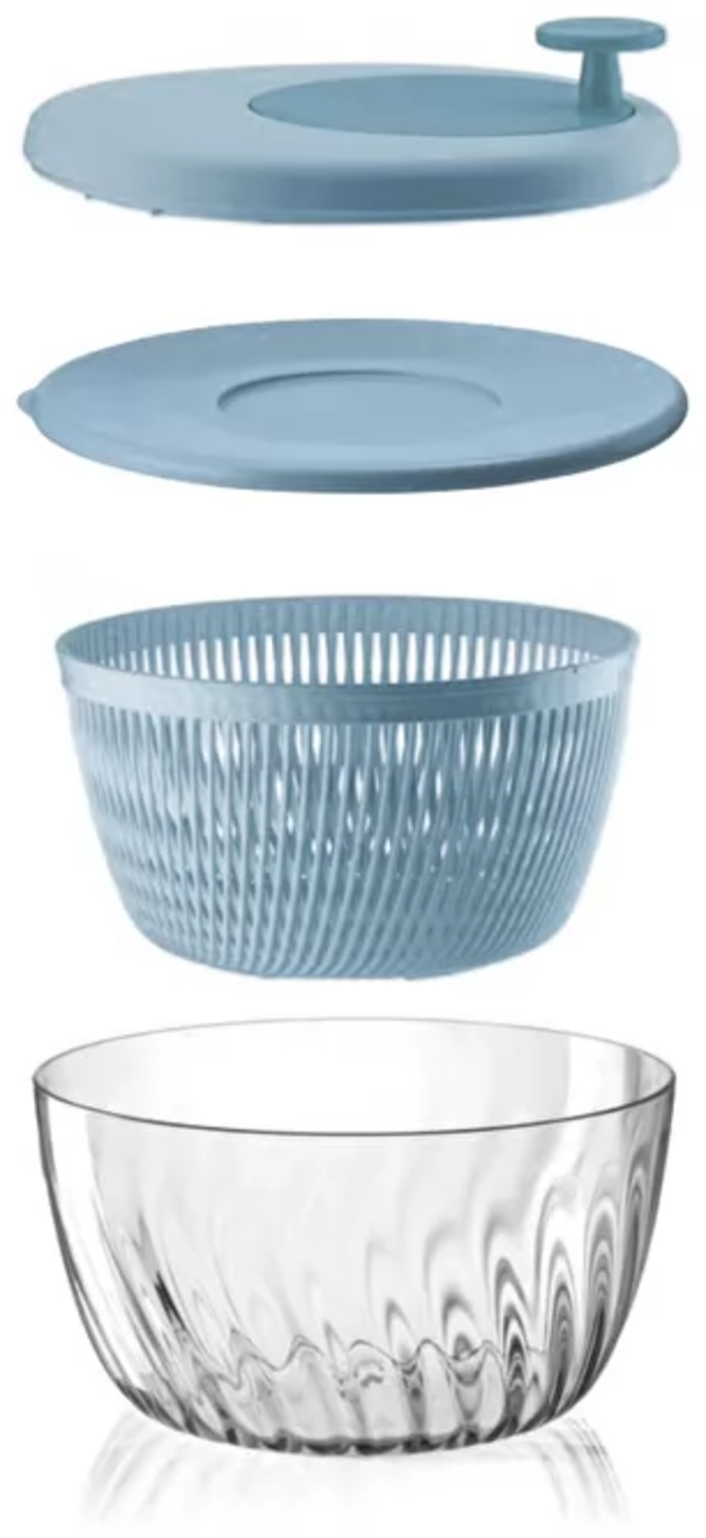 - 4-delni set, ki ga sestavljajo skleda za solato, vrteča se košara, pokrov z ročico in nepredušnega pokrov za ohranjanje svežine