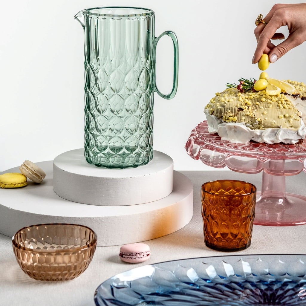 Izdelan je iz posebnega visokokakovostnega akrilnega stekla, ki izvira iz rastlinskih odpadkov, zato ne navdušuje le s svojo obliko, temveč tudi s svojo trajnostjo. Dobro premišljen pokrov, ki je opremljen z integrirano mrežico, je tudi izjemno praktičen. Ta zanesljivo ohranja ledene kocke v skledi. Za udobno rokovanje poskrbita tudi izliv, ki ne kaplja, in ergonomsko oblikovan ročaj. Vrč s kapaciteto 1750 ml je idealen za pogostitev gostov z osvežilnimi pijačami. Naj bo vaše naslednje srečanje eleganten dogodek!