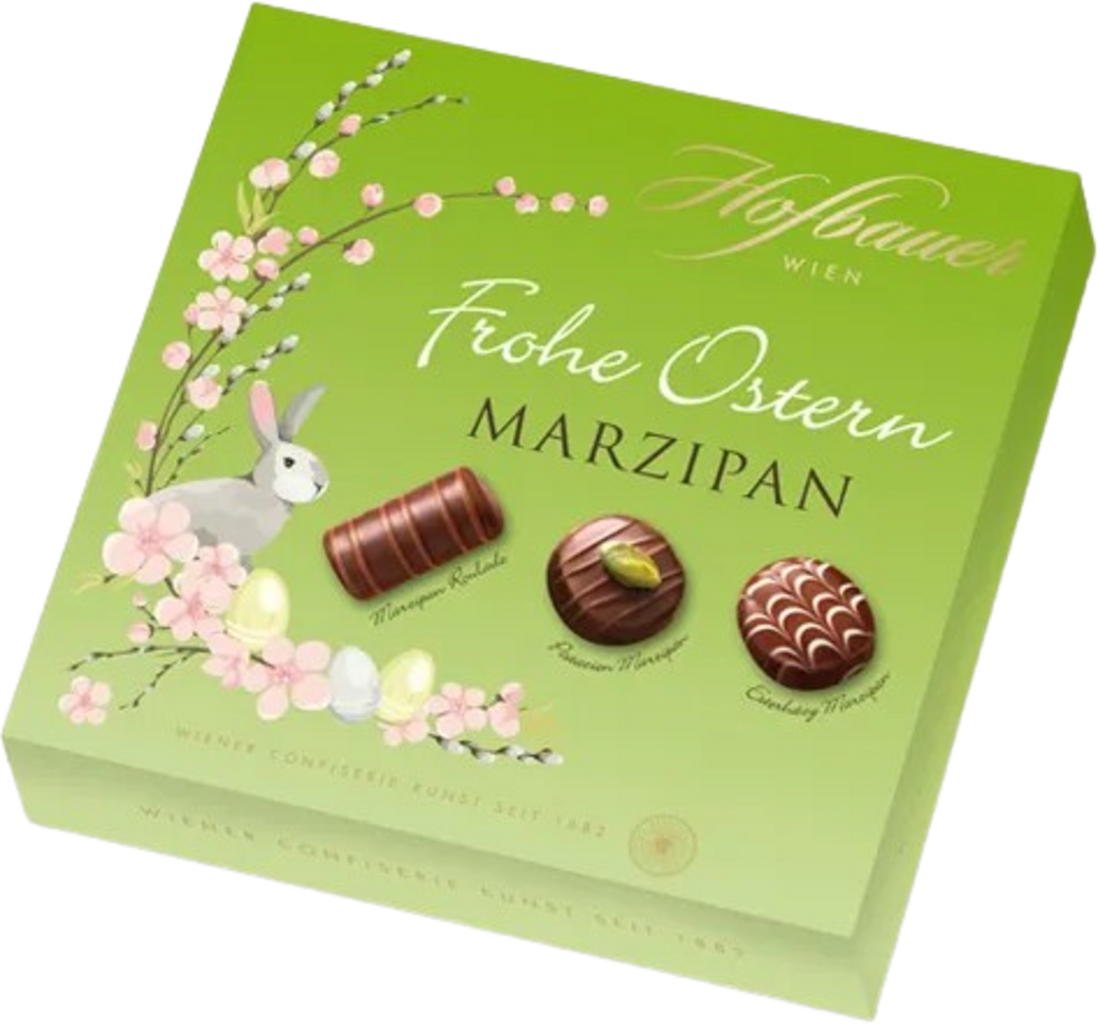 Uživajte v izvrstni izbiri pralin ""Vesela velika noč" - marcipan znamke Hofbauer, neposredno iz tradicionalne dunajske slaščičarne. Doživite popolno kombinacijo najfinejšega marcipana in mojstrske izdelave, zaradi česar je vsak kos resnično posebna poslastica. Barvita oblika z velikonočno tematiko doda popoln pridih vaši velikonočni košari in te praline naredi idealno darilo za vas ali za vaše najdražje!