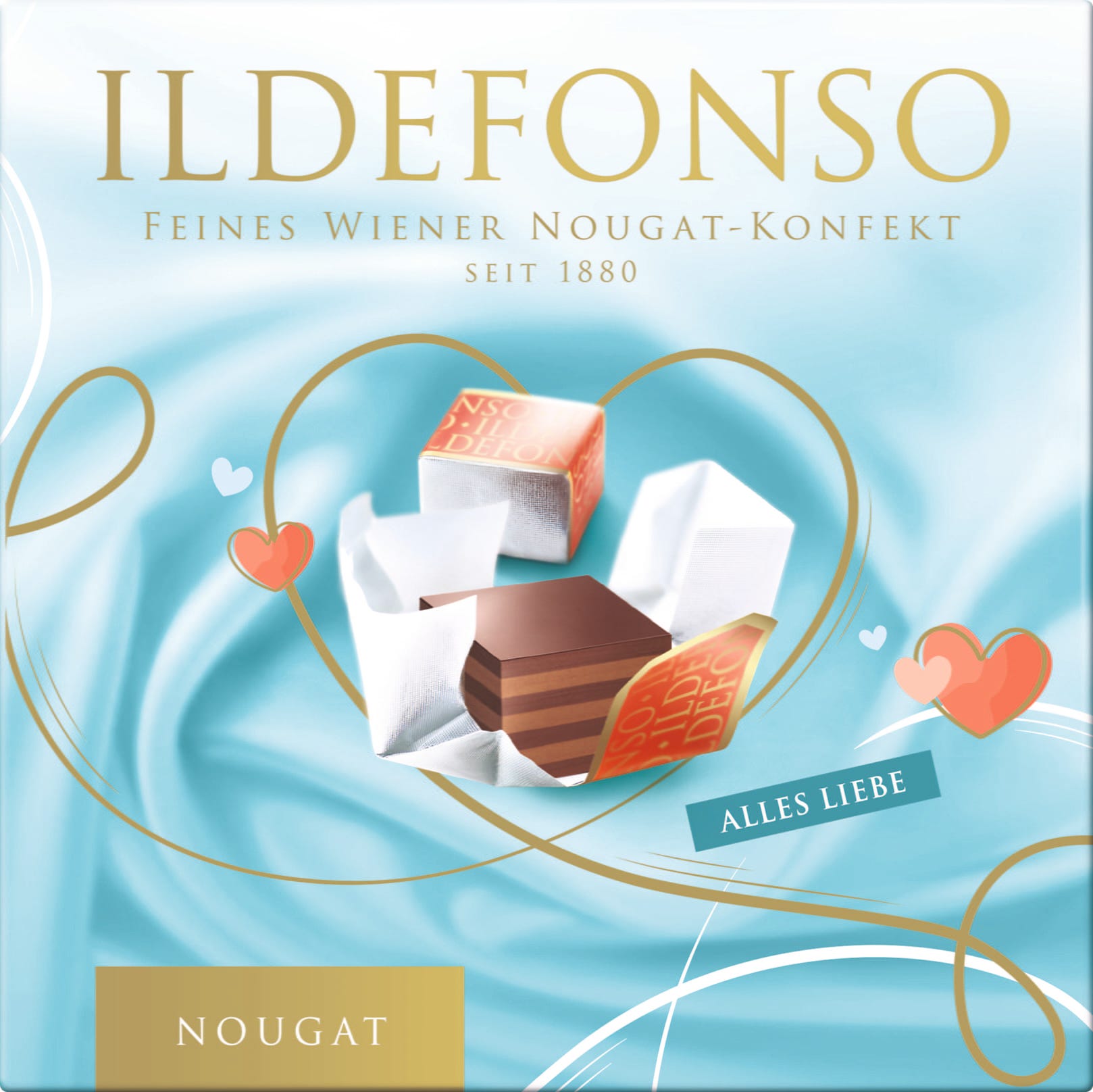 Tri svetle in štiri temne plasti najboljše čokolade gianduia. Ildefonso je malo zapeljevanje, ki brbončice razveseljuje že več kot 130 let. Embalaža s svojim roza in srebrnim ovojem je skoraj tako legendarna kot izjemen okus teh slavnih kreminijev. Znotraj ovoja je nekaj biserov modrosti in citatov (v nemščini), da se spomnimo mita, po katerem je Don Alonso tako poslal skrivna ljubezenska sporočila svoji ljubljeni Doña Eleni, skrita med čokoladami.