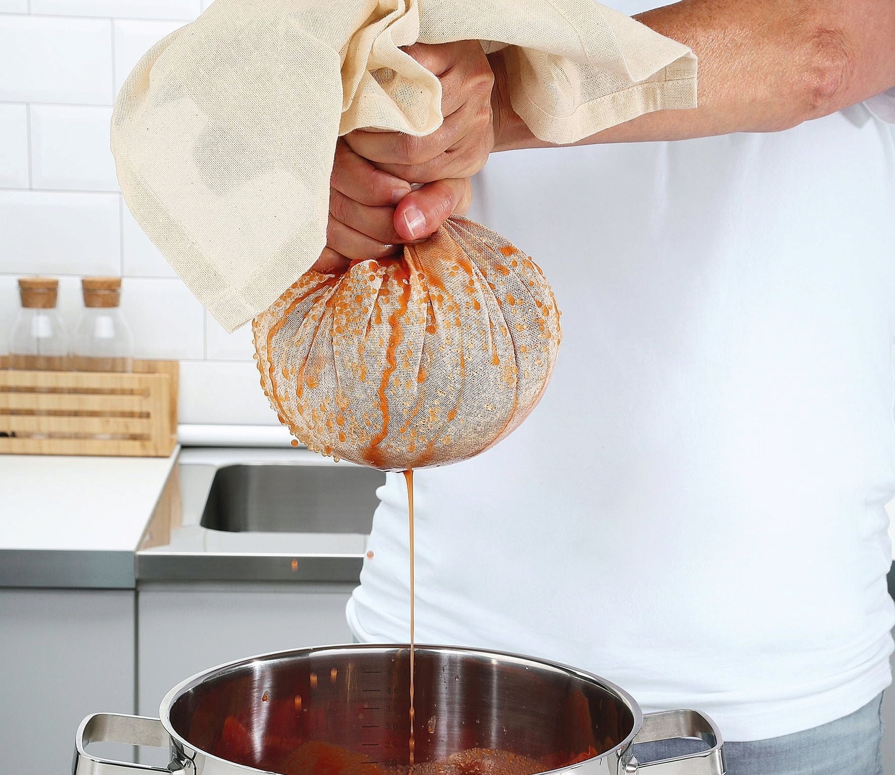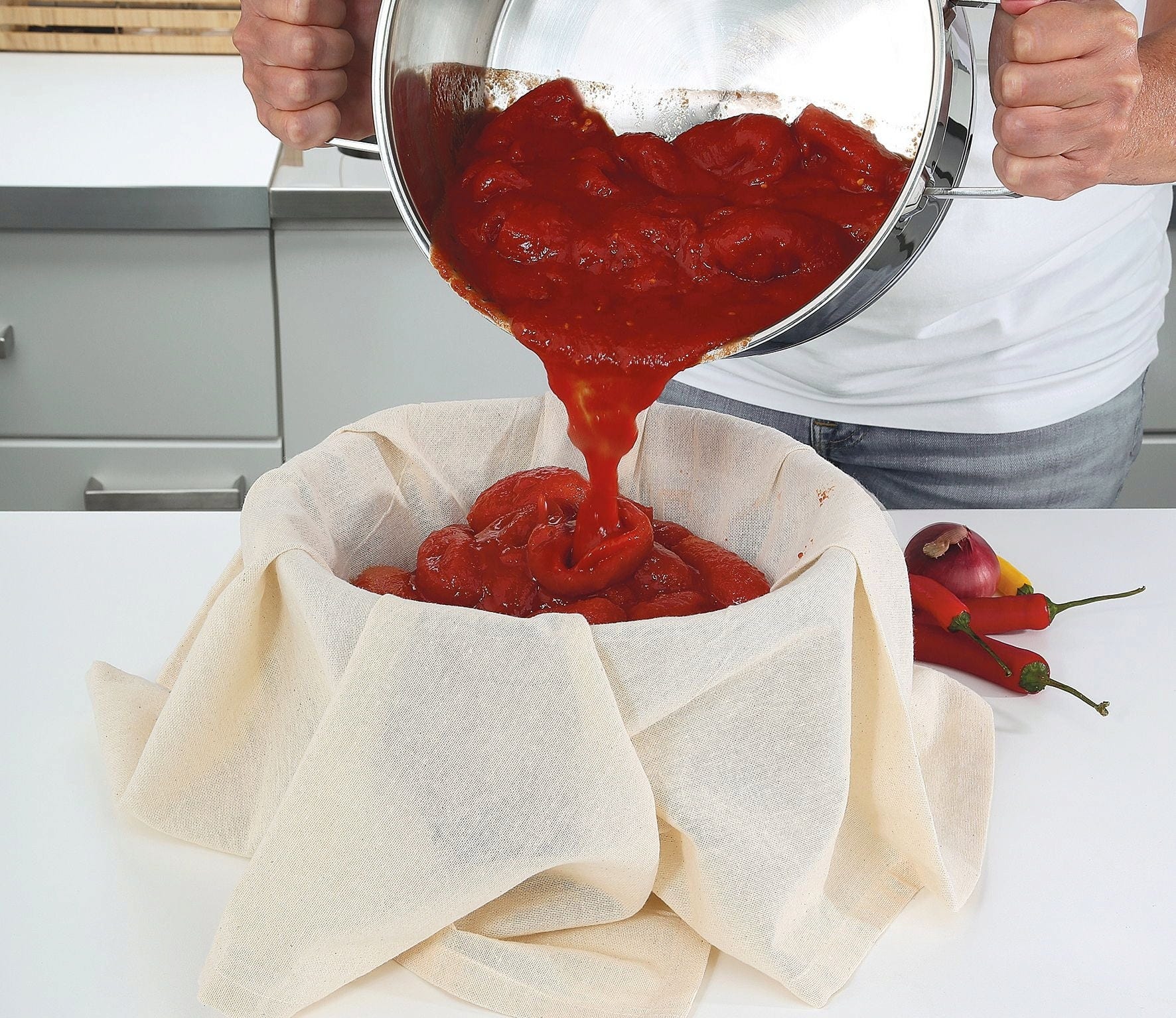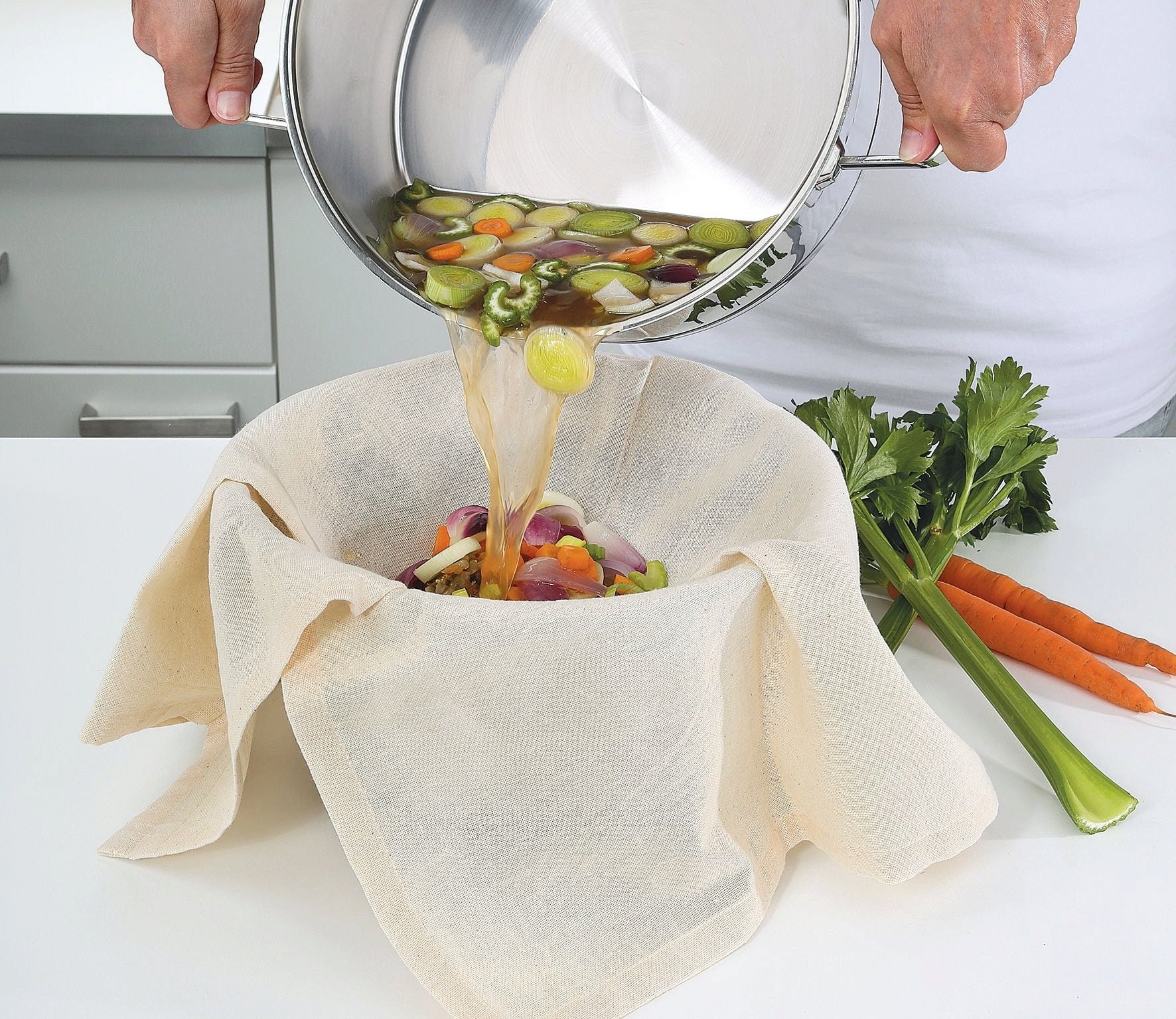 Ta vsestranska krpa za precejanje je narejena iz naravnega bombaža in je nepogrešljiva v vsaki kuhinji.