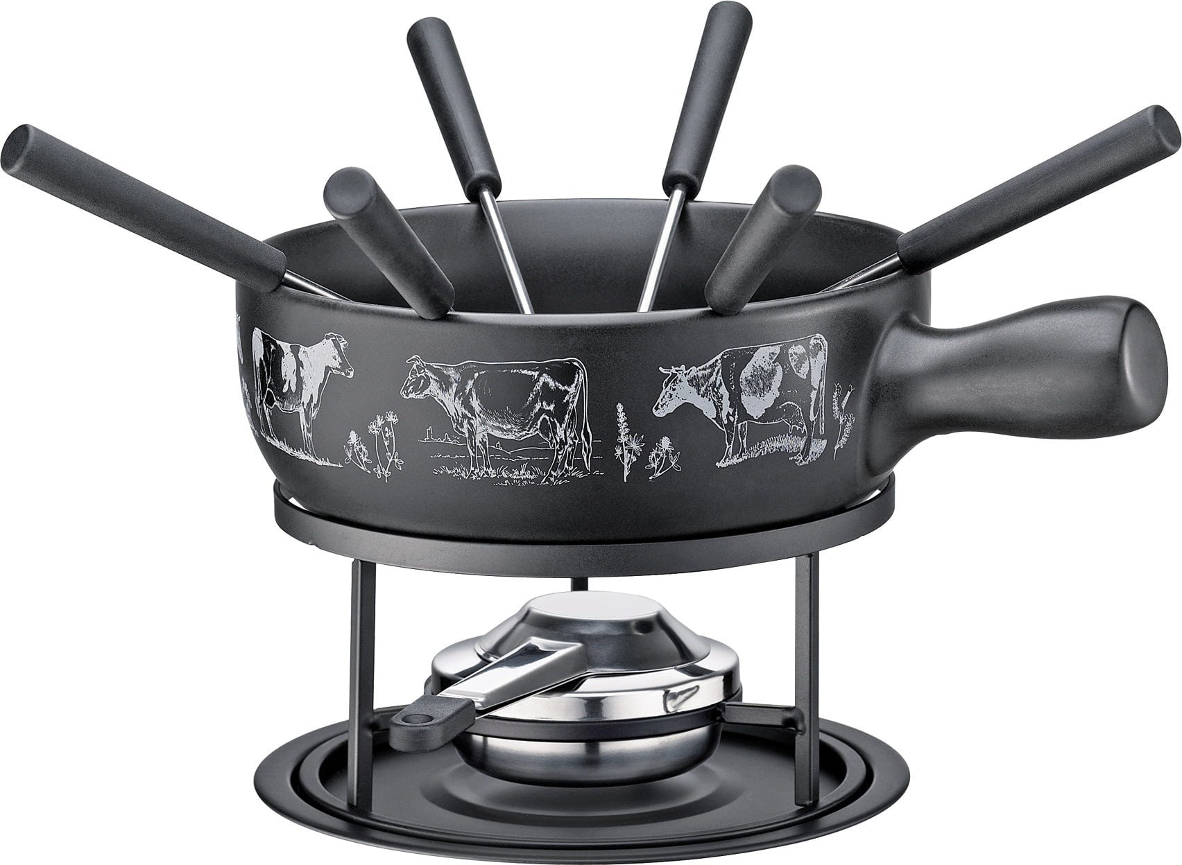 Vsebina seta: lonec za fondi, stojalo, podstavek, gorilnik na varno pasto, 6 vilic za fondi