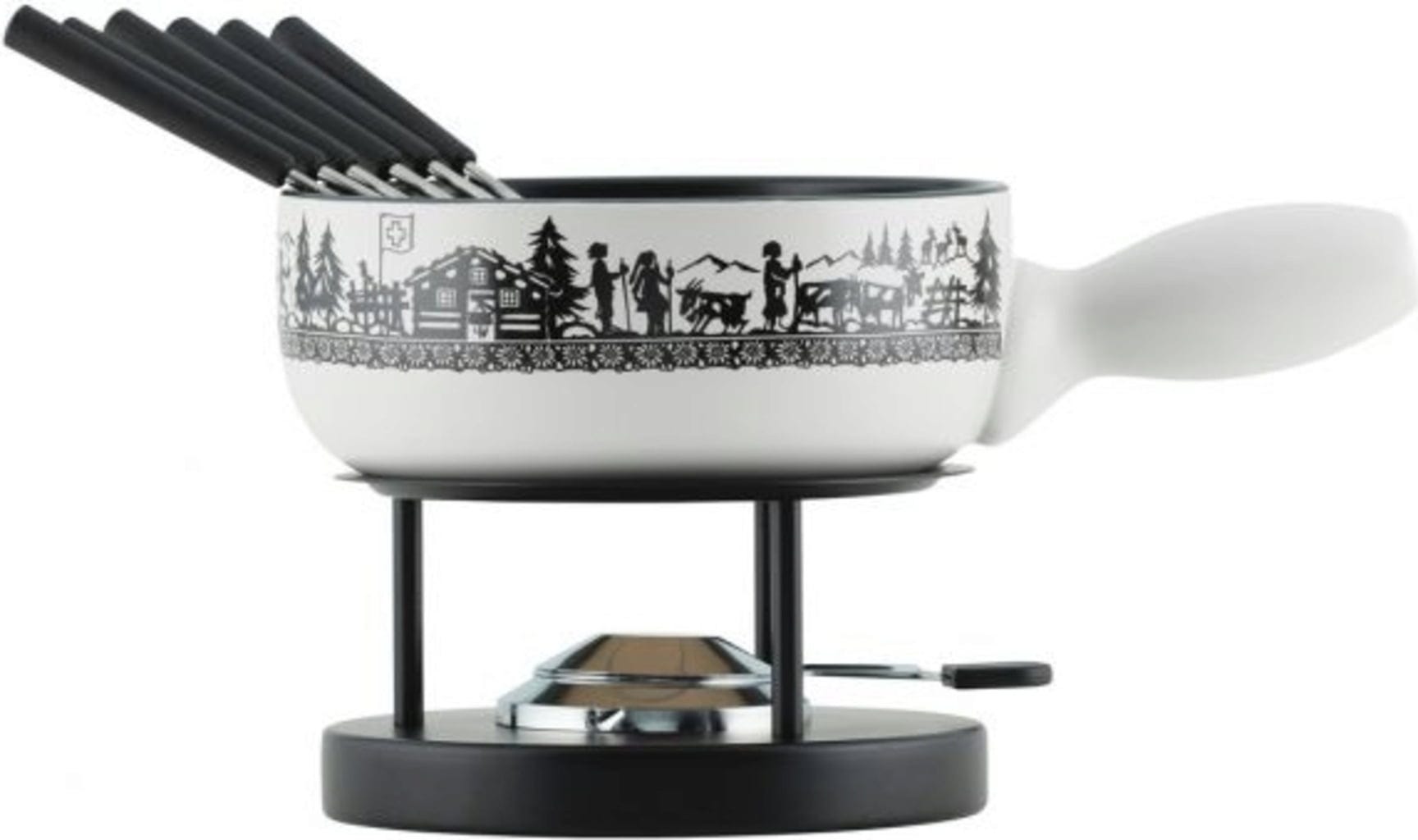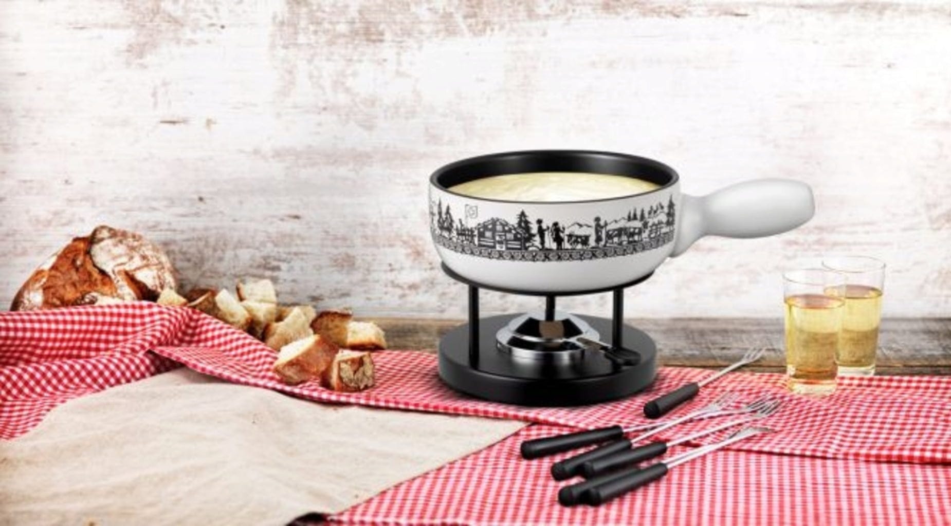 Barve in dizajn spominjajo na švicarske Alpe, sneg in božič ter odlično zaokrožijo ambient na fondu večer s prijatelji ali družino. Preprosto prižgite gorilnik in uživajte.