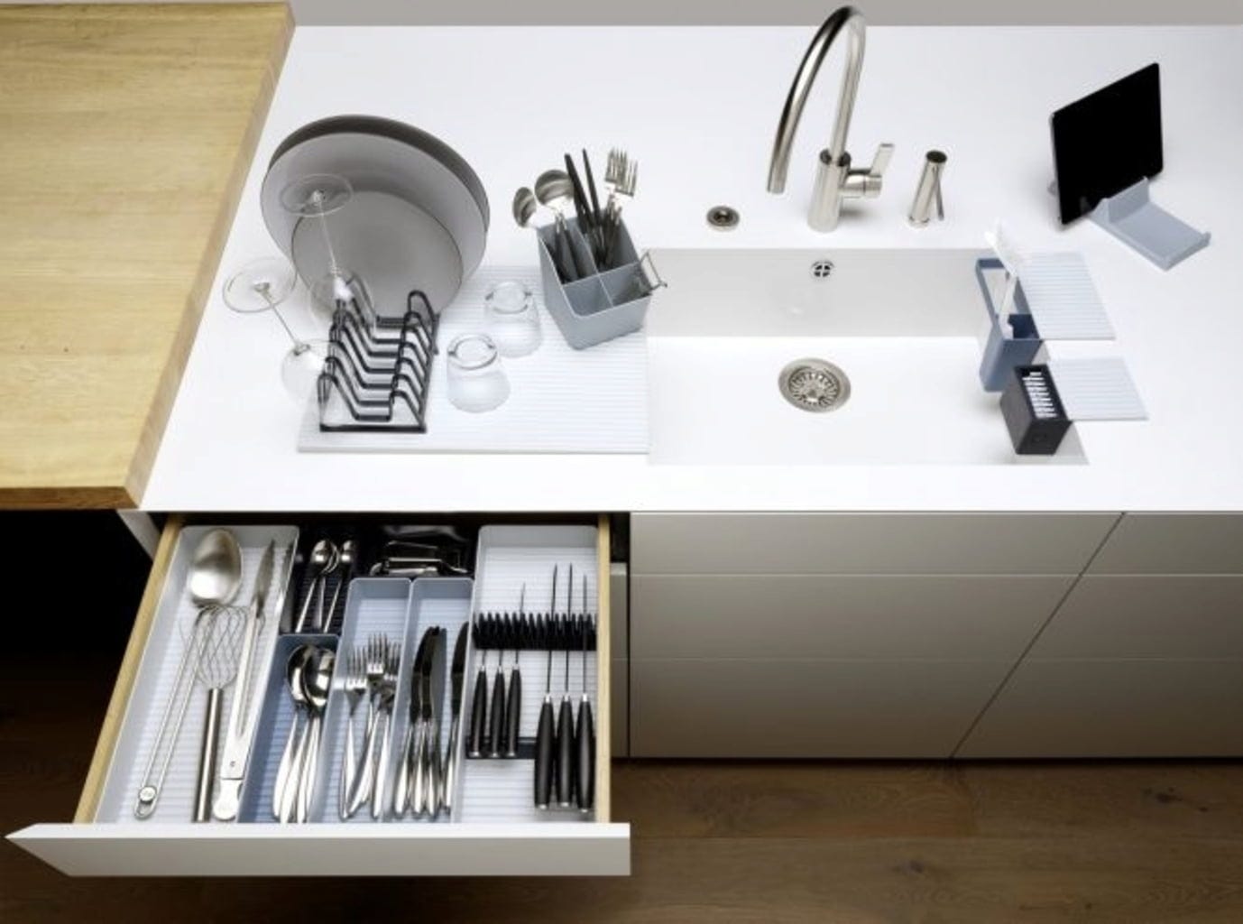 Pametni vložek za predale je idealen za hitro iskanje kuhinjskih pripomočkov ali celo pisarniškega materiala. Zagotavlja red in enostavno odstranjevanje zahvaljujoč valovitemu dnu.